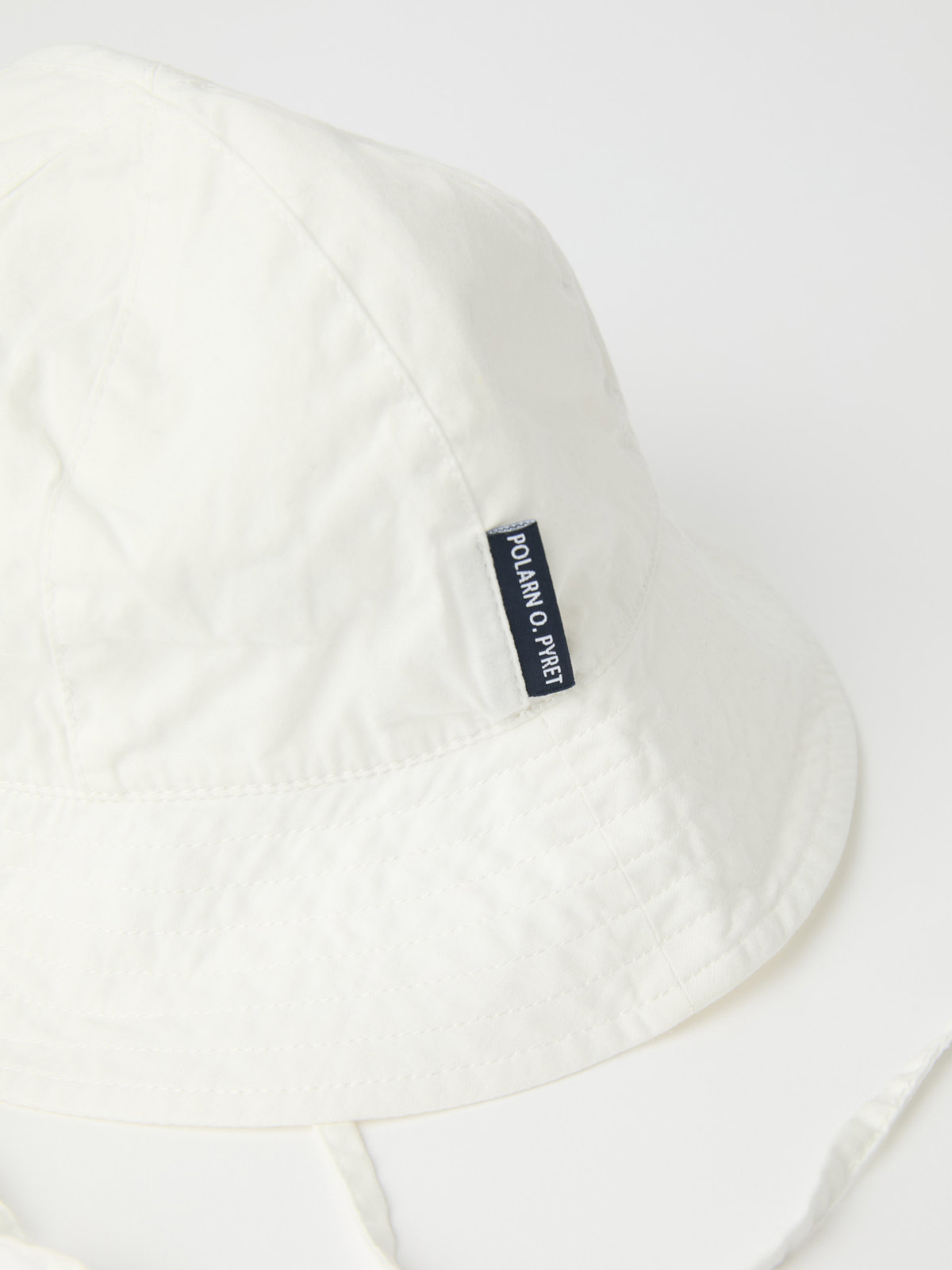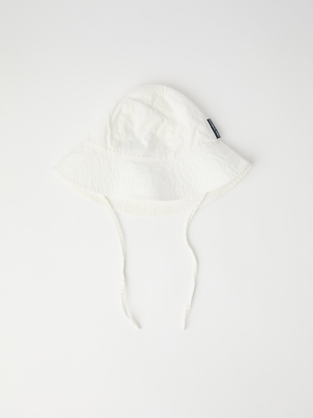 Enfärgad solhatt med knytband. Solhatten är tillverkad i 100% ekologisk bomull och har UV-skydd UPF 50. Knytbanden under hakan håller solhatten på plats.