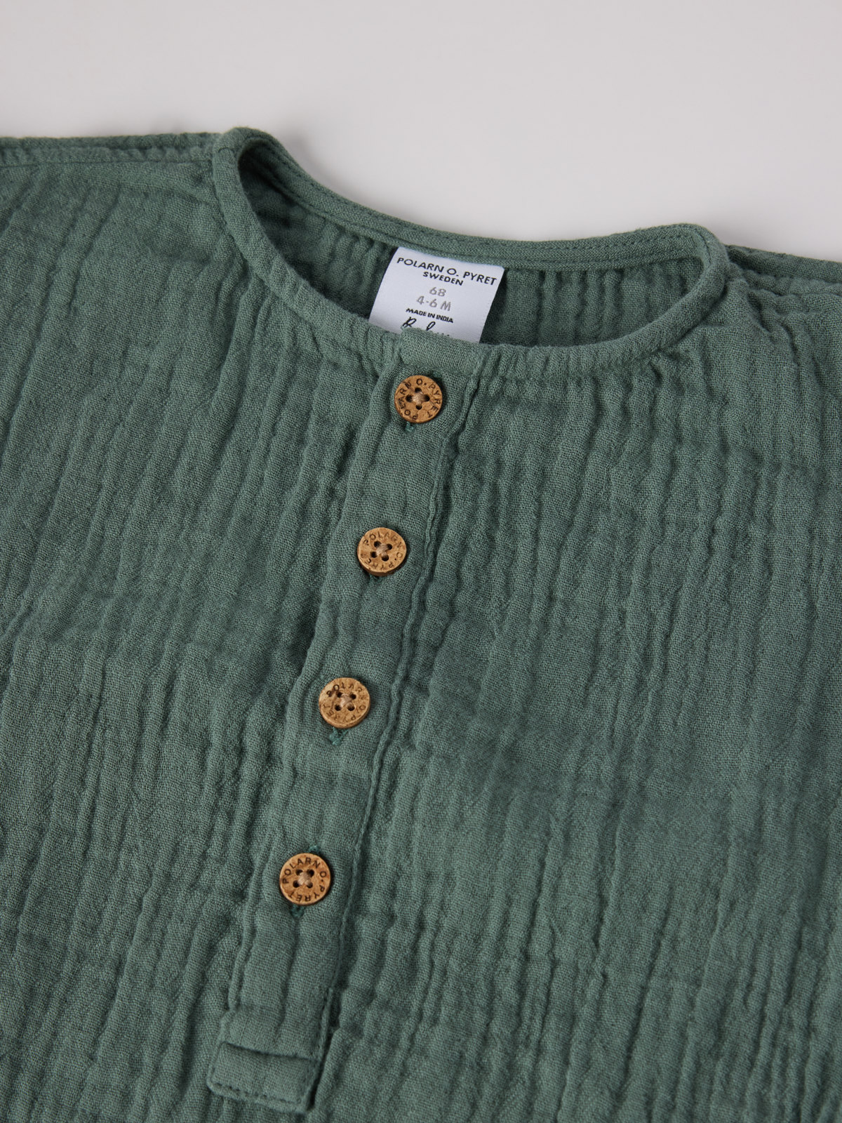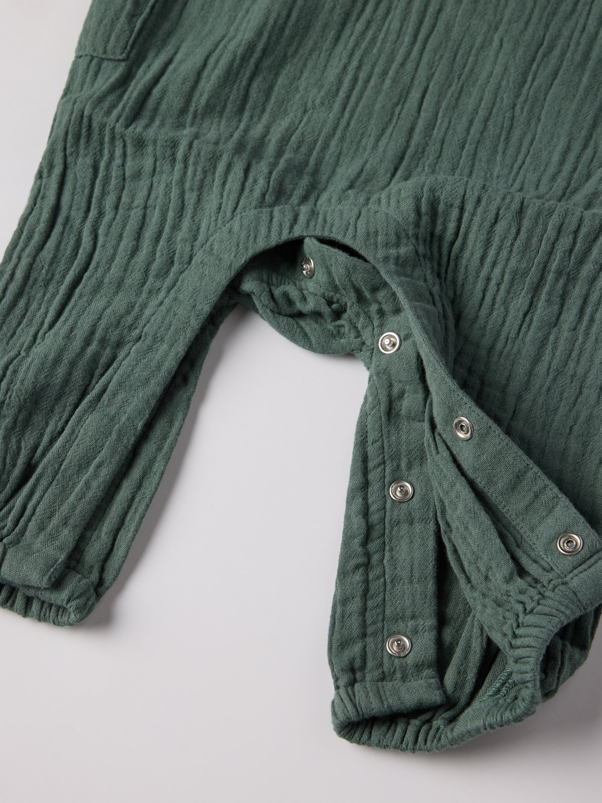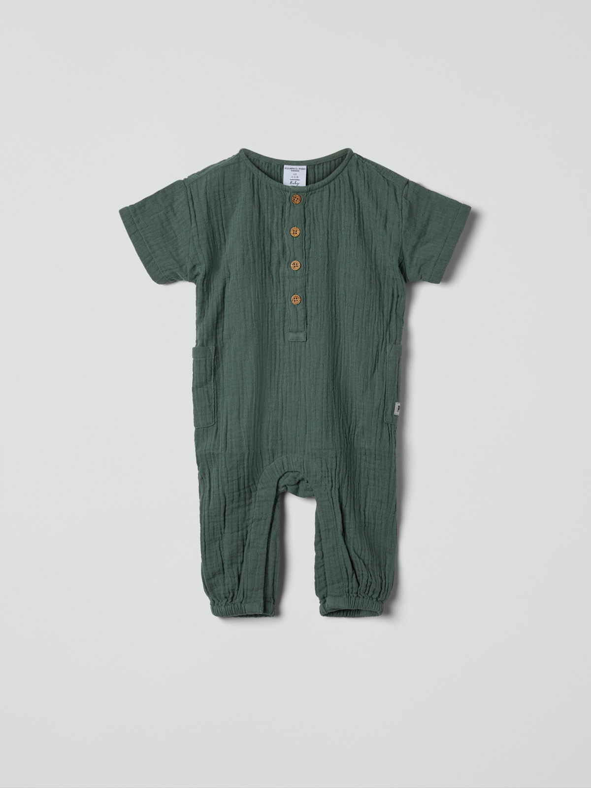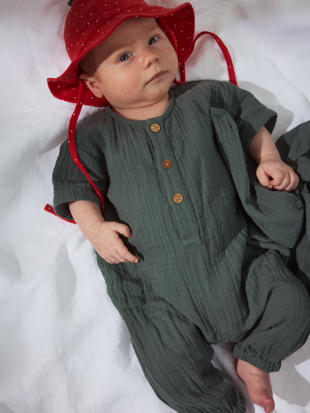 Rymlig kortärmad playsuit i mjuk muslin av 100 % ekologisk bomull för baby – en riktigt skön sommarfavorit! Playsuiten stängs med knappar fram och har två stora fickor samt elastiskt beslut för skön passform.
