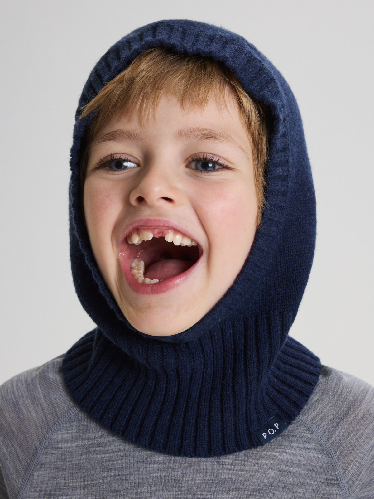 Enfärgad balaklava i värmande merinoull- och bomullsmix. Perfekt för vinterutflykter eller i skidbacken! Ribbad mudd runt ansikte och hals ger skön passform.