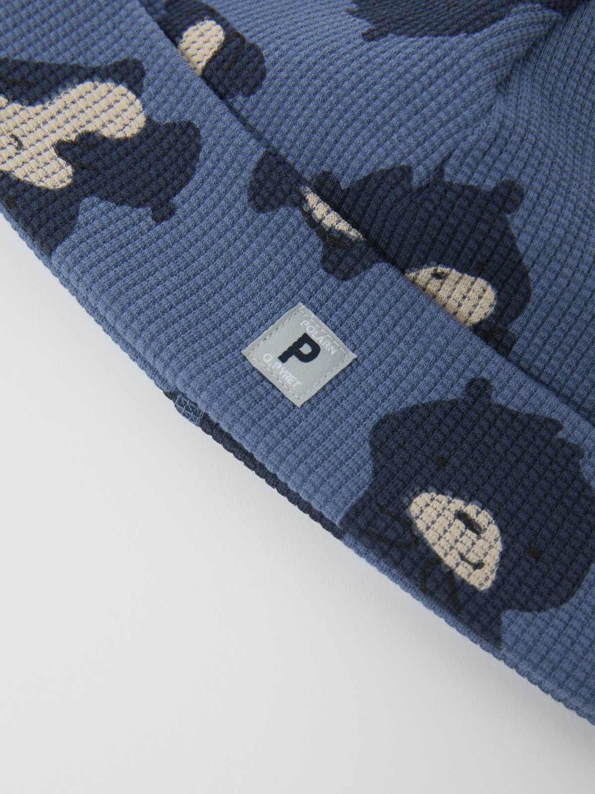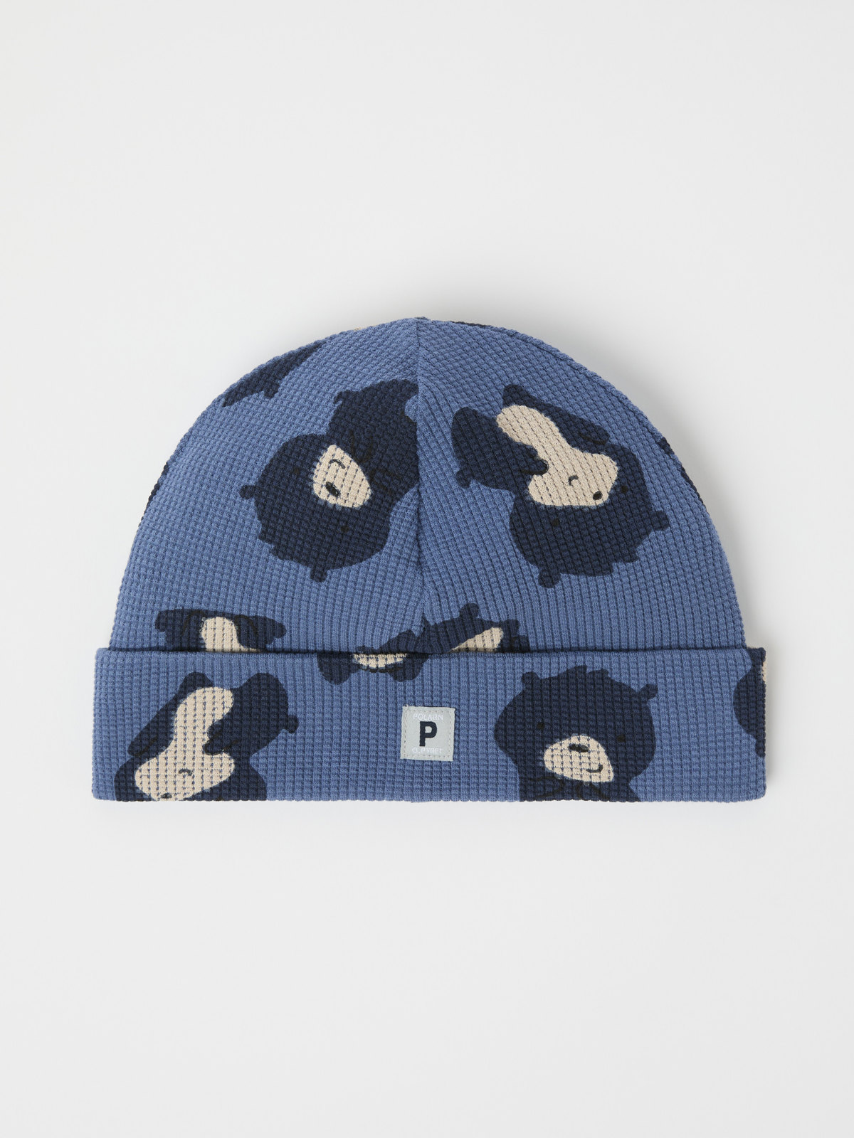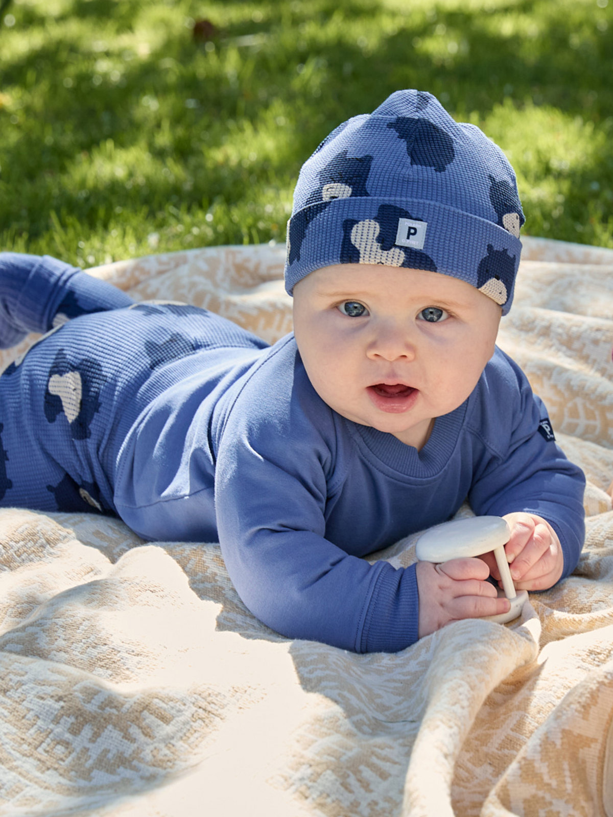 Ribbad mössa för baby i 100 % ekologisk bomullstrikå, helmönstrad med små björnar.