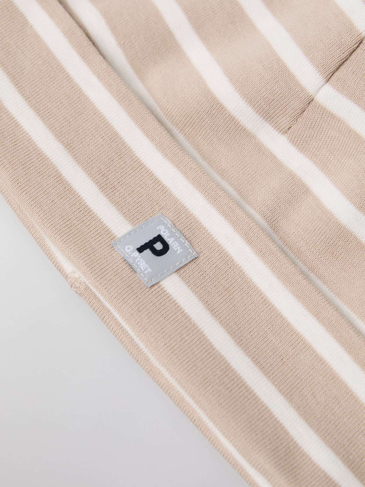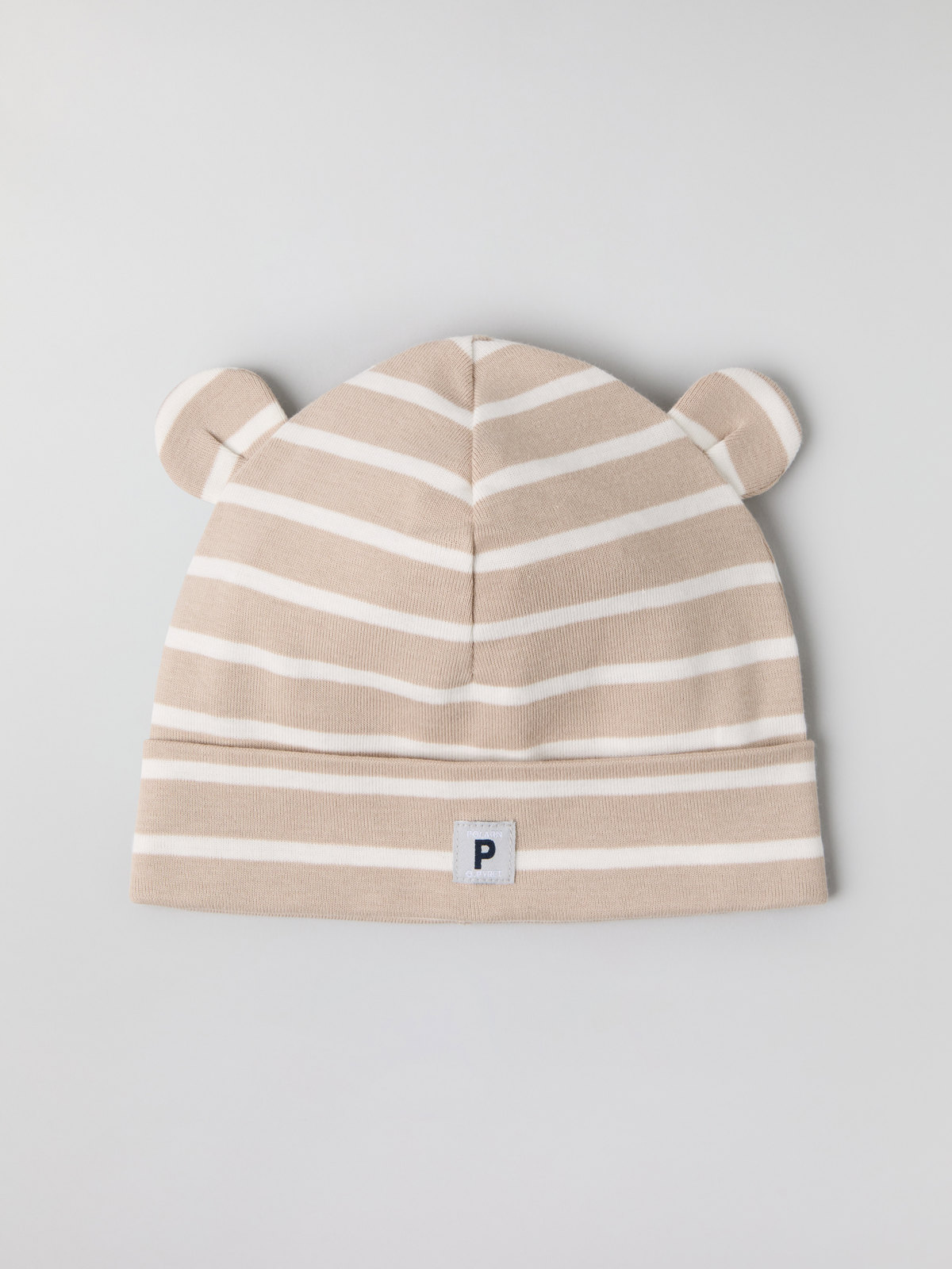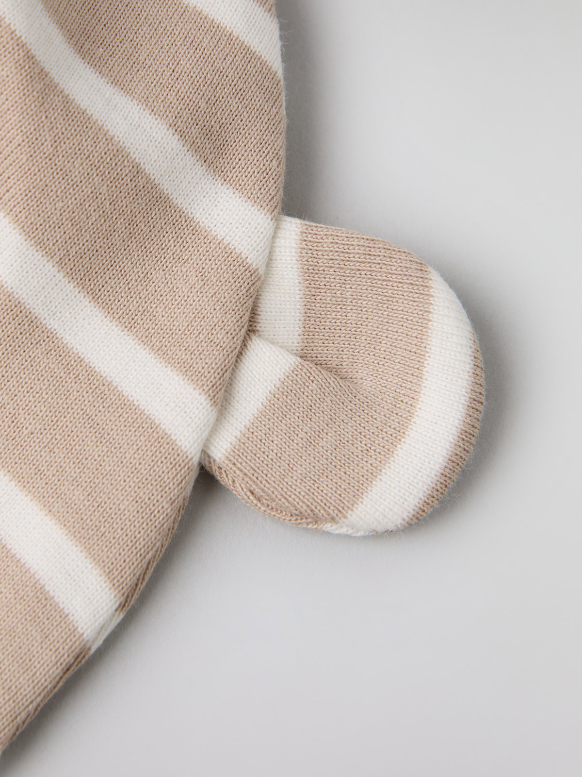Randig mössa i 100% ekologisk bomullstrikå för baby. Mössan är prydd med påsydda öron, och har ett uppvik som kan justeras efter bebisens huvudstorlek.