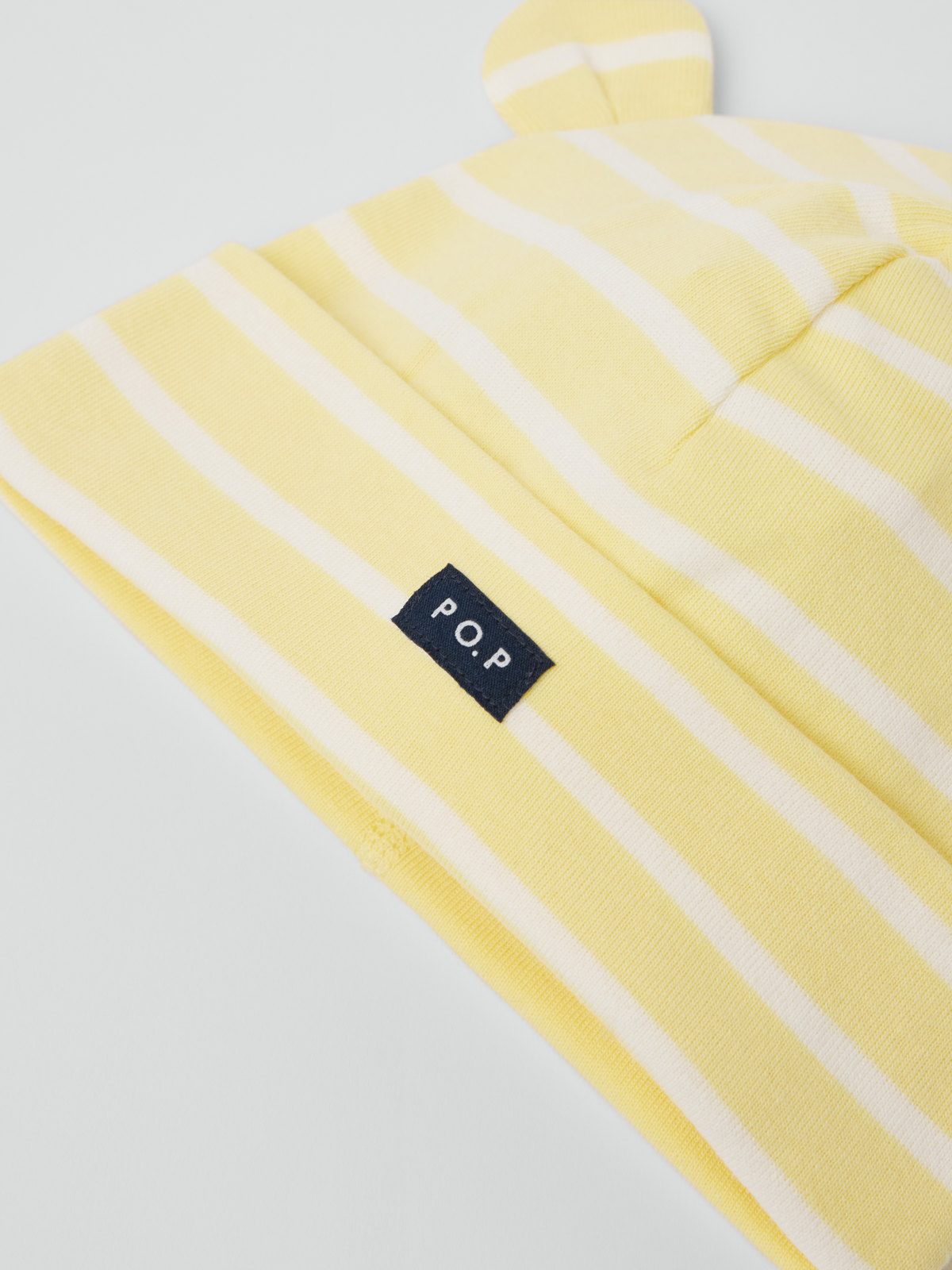 Vår klassiska randiga mössa i 100 % ekologisk bomullstrikå för baby. Mössan är prydd med påsydda öron och har ett uppvik som kan justeras efter bebisens huvudstorlek.