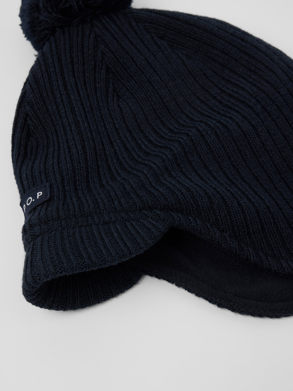 Ribbstickad mössa i varm ull med mjukt fleecefoder av återvunnen polyester. Mössan går ner ordentligt över öronen och har en skärm framtill som ger extra skydd mot väder och vind. Uppe på huvudet har mössan en dekorativ pom-pom.