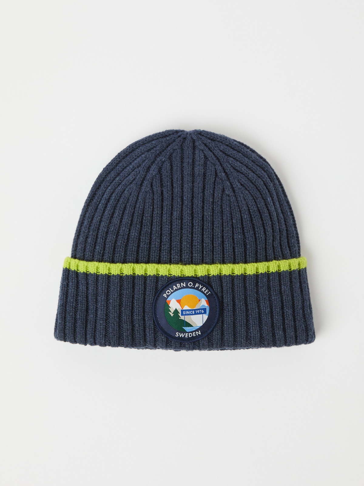 Ribbstickad mössa värmande ullmix. Mössan har ett mjukt uppvik med en fin appliktion fram.