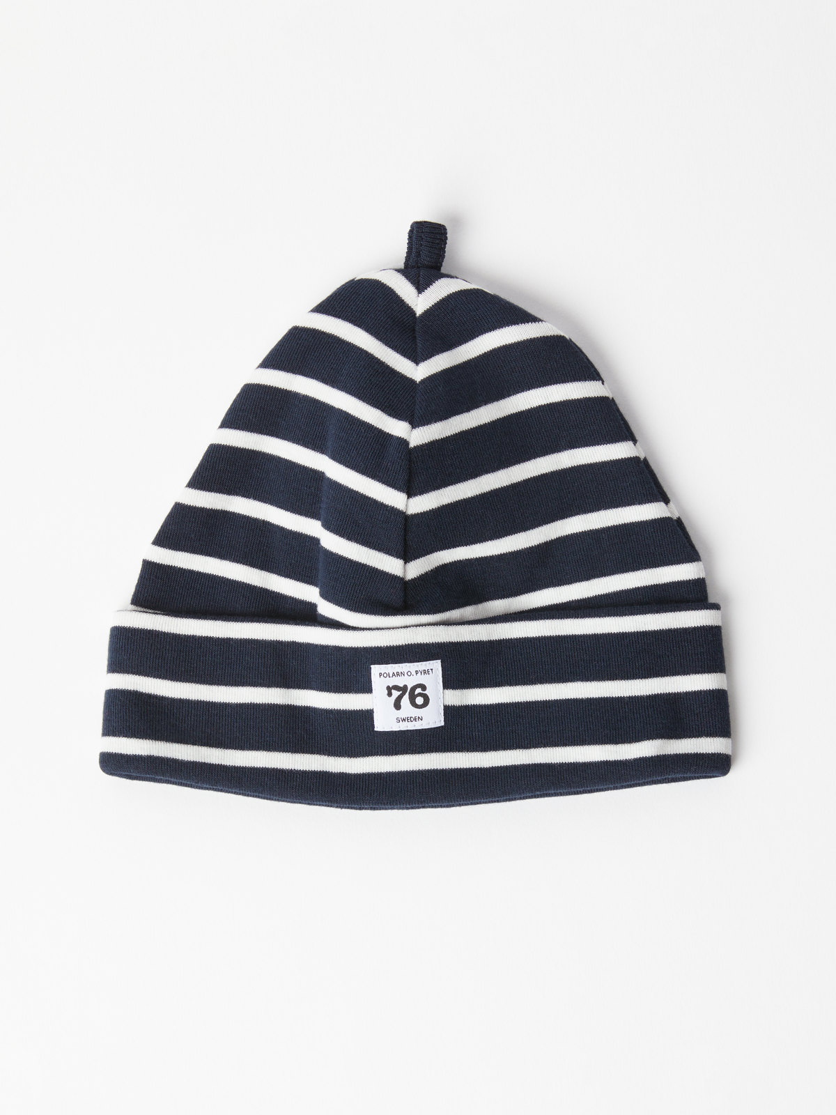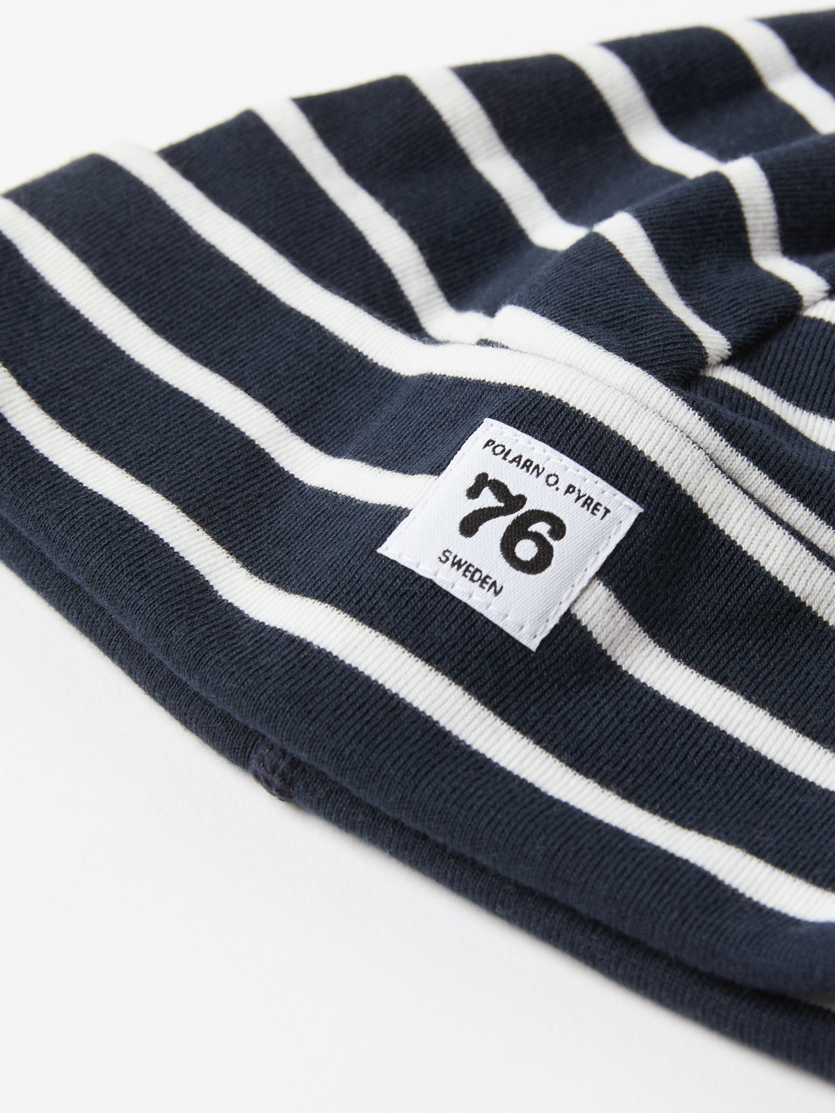 Randig mössa i 100 % ekologisk bomullstrikå för baby. Mössan är sydd med extra mjuka sömmar som är skonsamma mot känslig hud och har ett uppvik som kan justeras efter bebisens huvudstorlek.