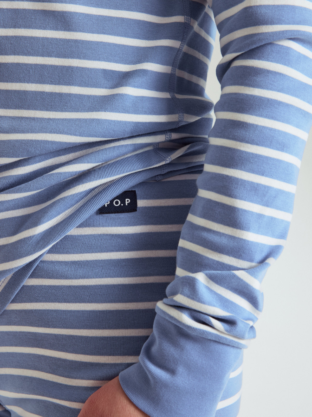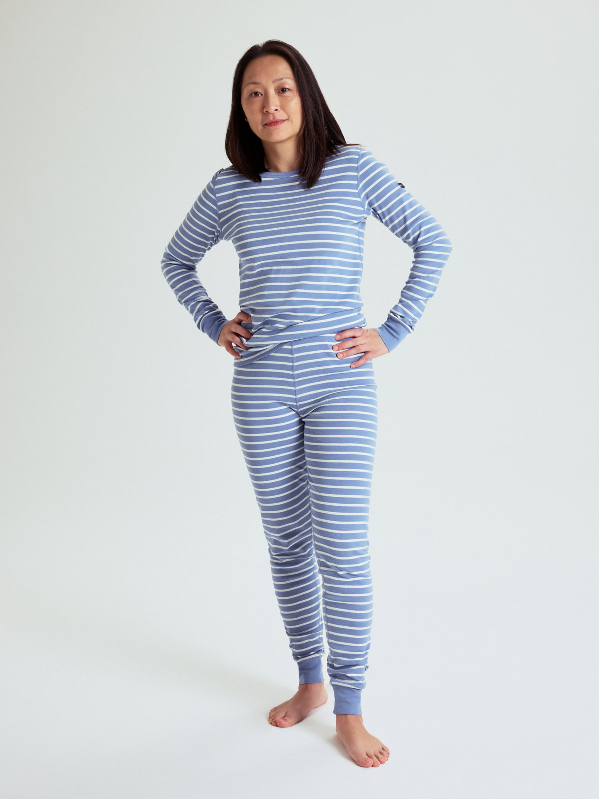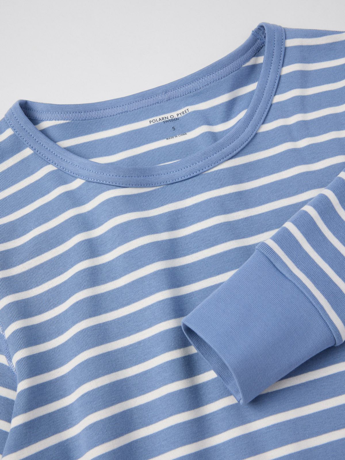 Set med tröja och byxa i vår klassiska rand för vuxen. Tröjan har mjuk ribbad mudd kring halsringning och vid ärmslut. Byxan har elastisk midja och mjuk ribbad mudd vid benslut.