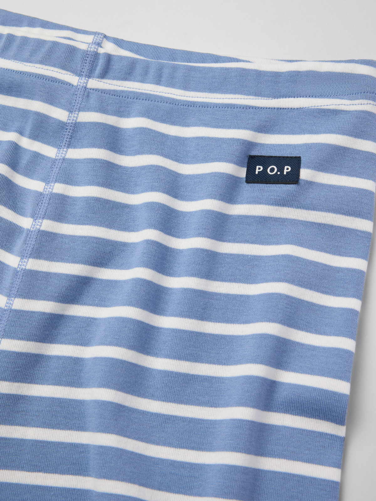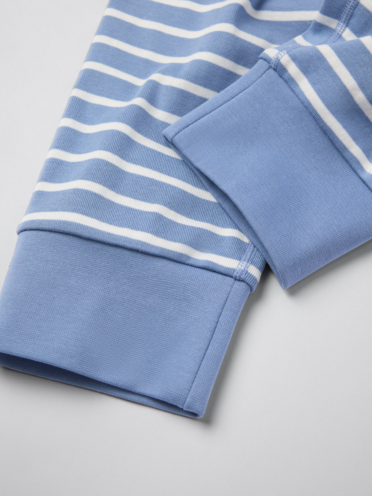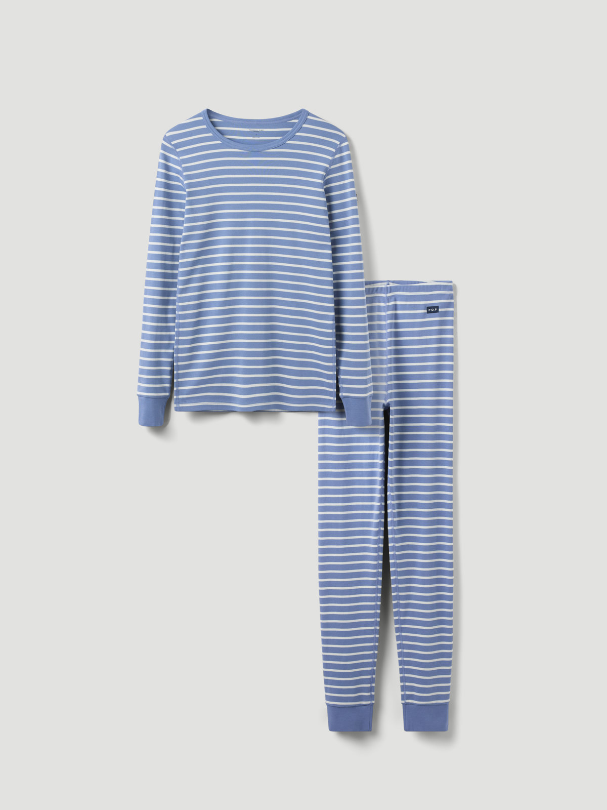 Set med tröja och byxa i vår klassiska rand för vuxen. Tröjan har mjuk ribbad mudd kring halsringning och vid ärmslut. Byxan har elastisk midja och mjuk ribbad mudd vid benslut.