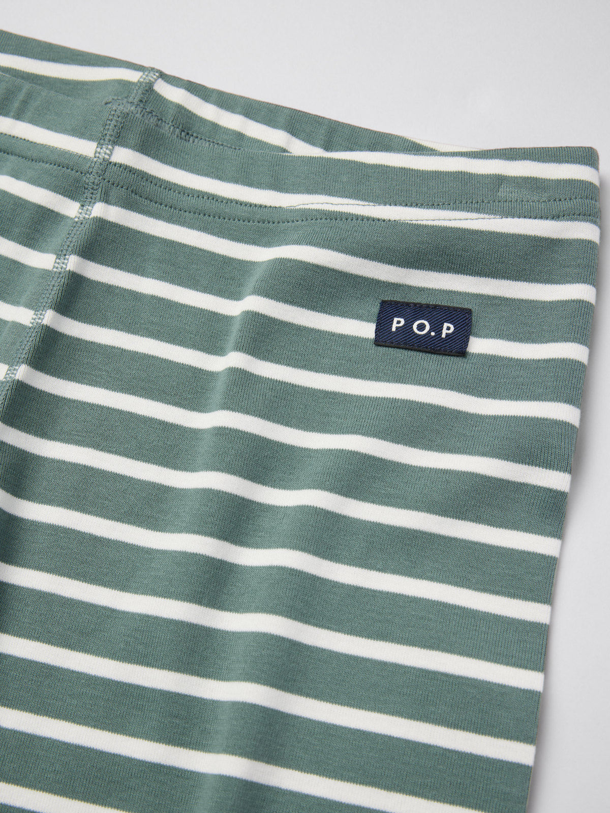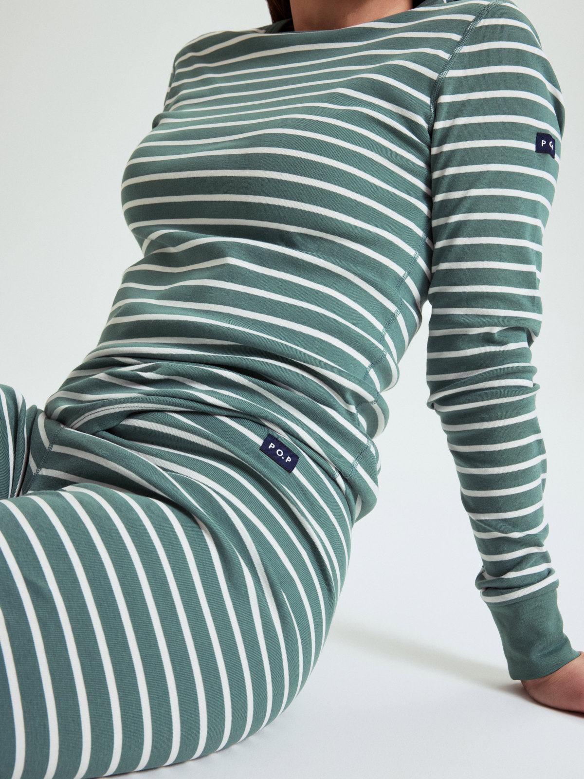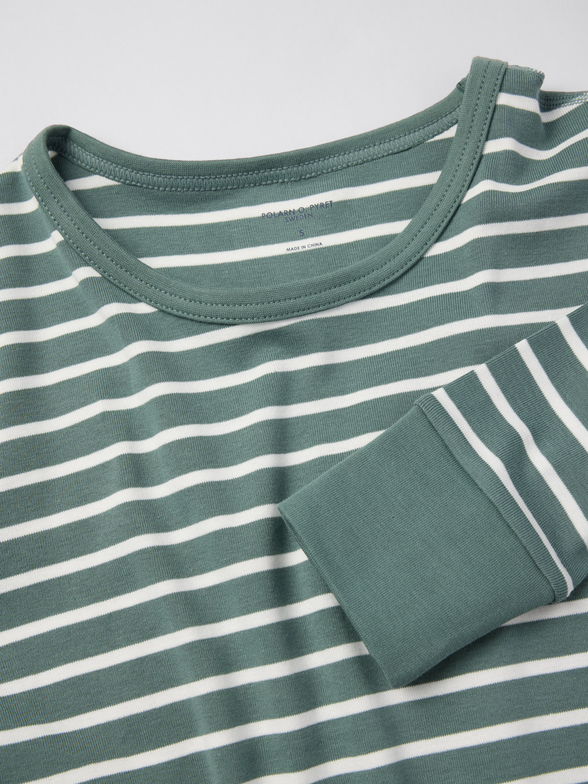 Set med tröja och byxa i vår klassiska rand för vuxen. Tröjan har mjuk ribbad mudd kring halsringning och vid ärmslut. Byxan har elastisk midja och mjuk ribbad mudd vid benslut.