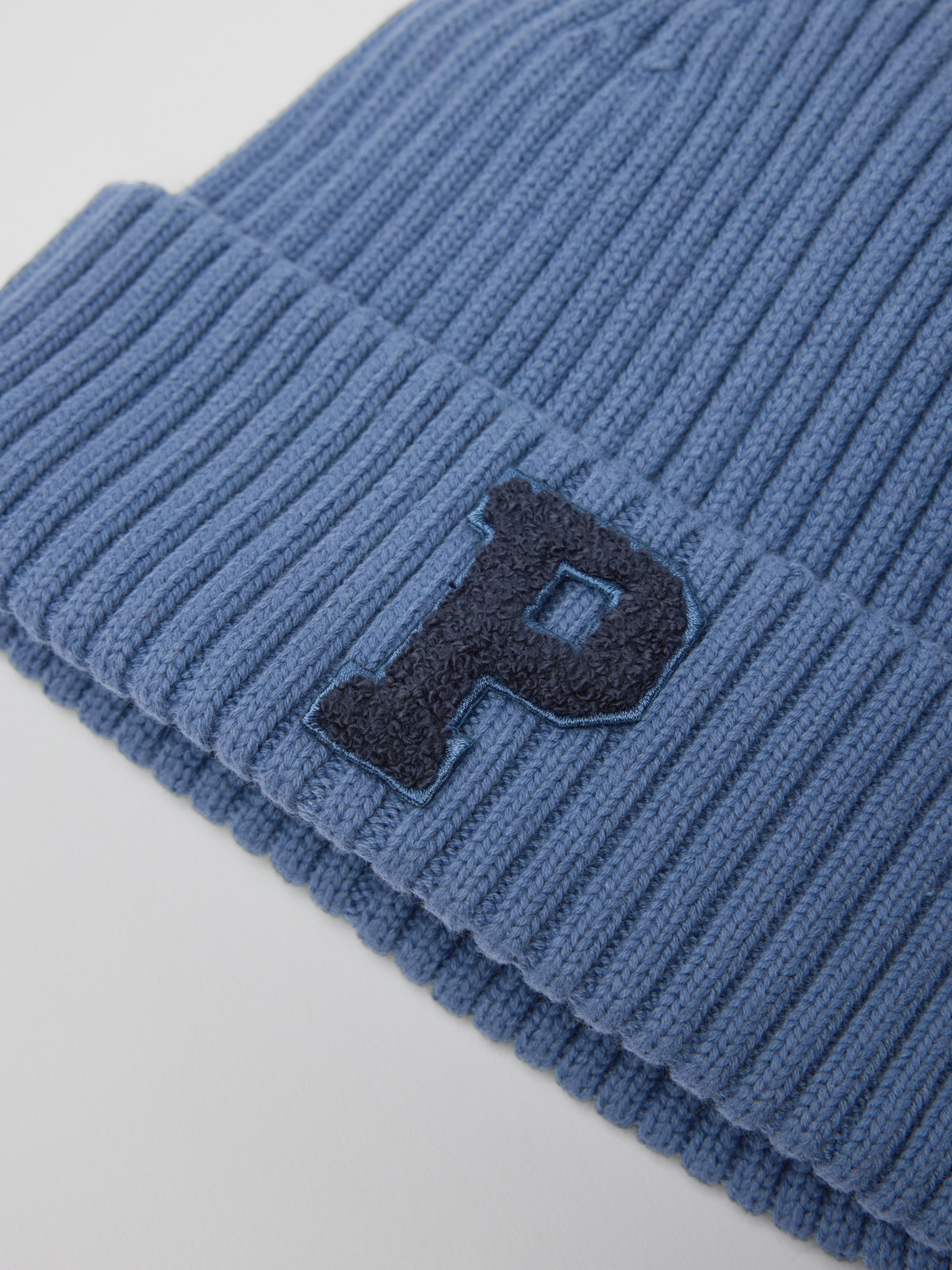 Ribbstickad mössa i ekologisk bomull – perfekt för småkyliga höst- och vårdagar. Mössan har ett uppvik i nederkant och en P-applikation fram.