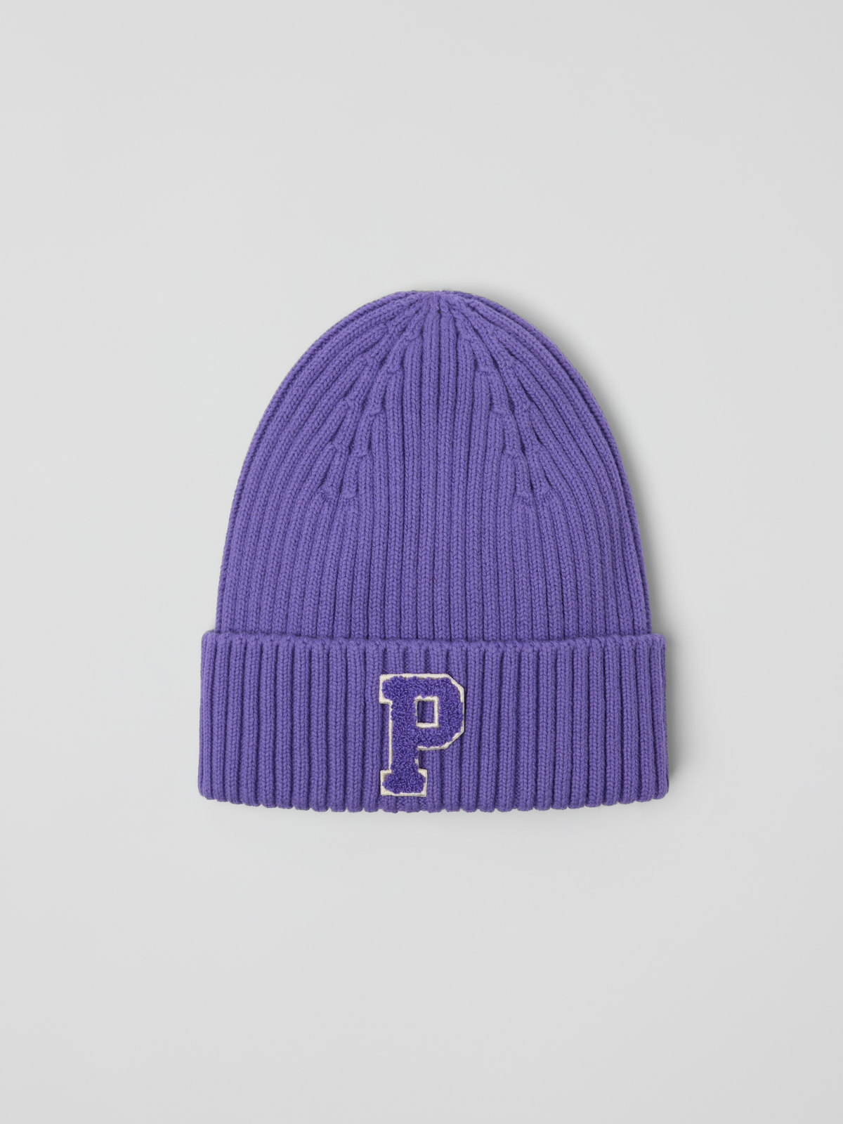 Ribbstickad mössa i ekologisk bomull – perfekt för småkyliga höst- och vårdagar. Mössan har ett uppvik i nederkant och en P-applikation fram.