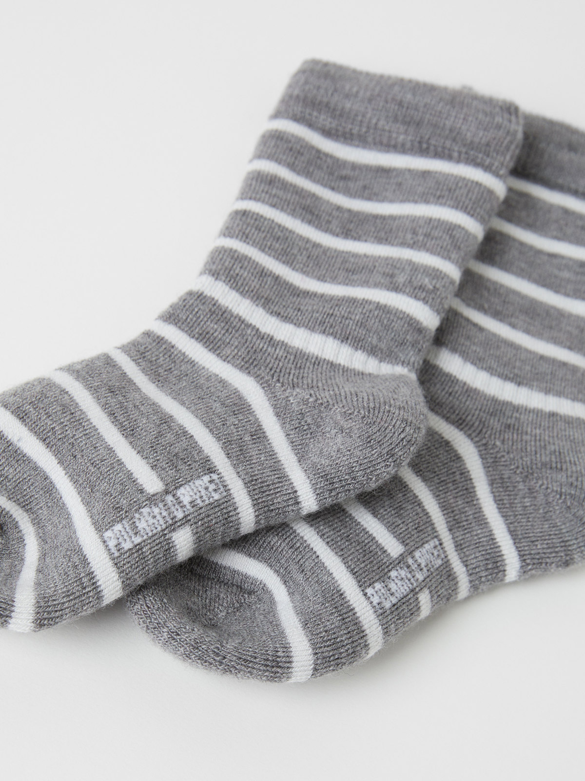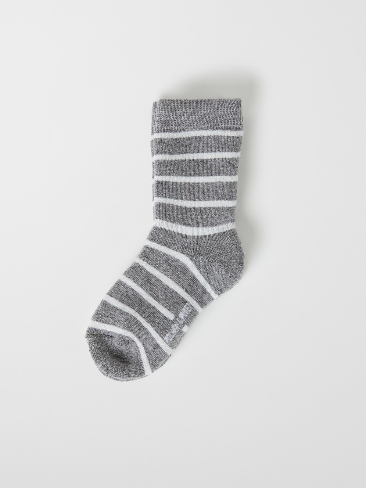 Ett par randiga strumpor i mjuk ullfrotté som håller små fötter varma. Strumporna har vår klassiska rand. Storleken är markerad på insidan av skaftet. Där finns även plats att skriva barnets namn. Lätt att hålla ordning!