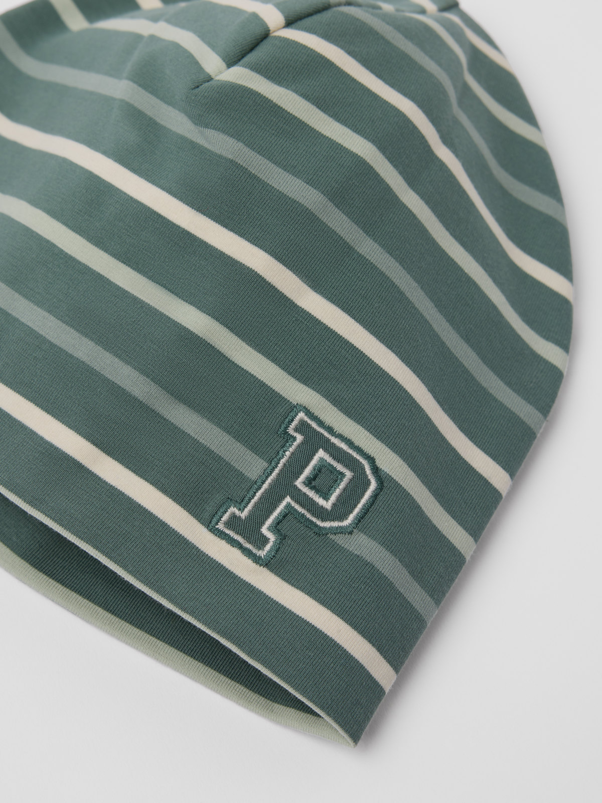 En tunn, multirandig trikåmössa i mjuk ekologisk bomull. Mössan har vår klassiska rand och är prydd med en P-applikation fram.