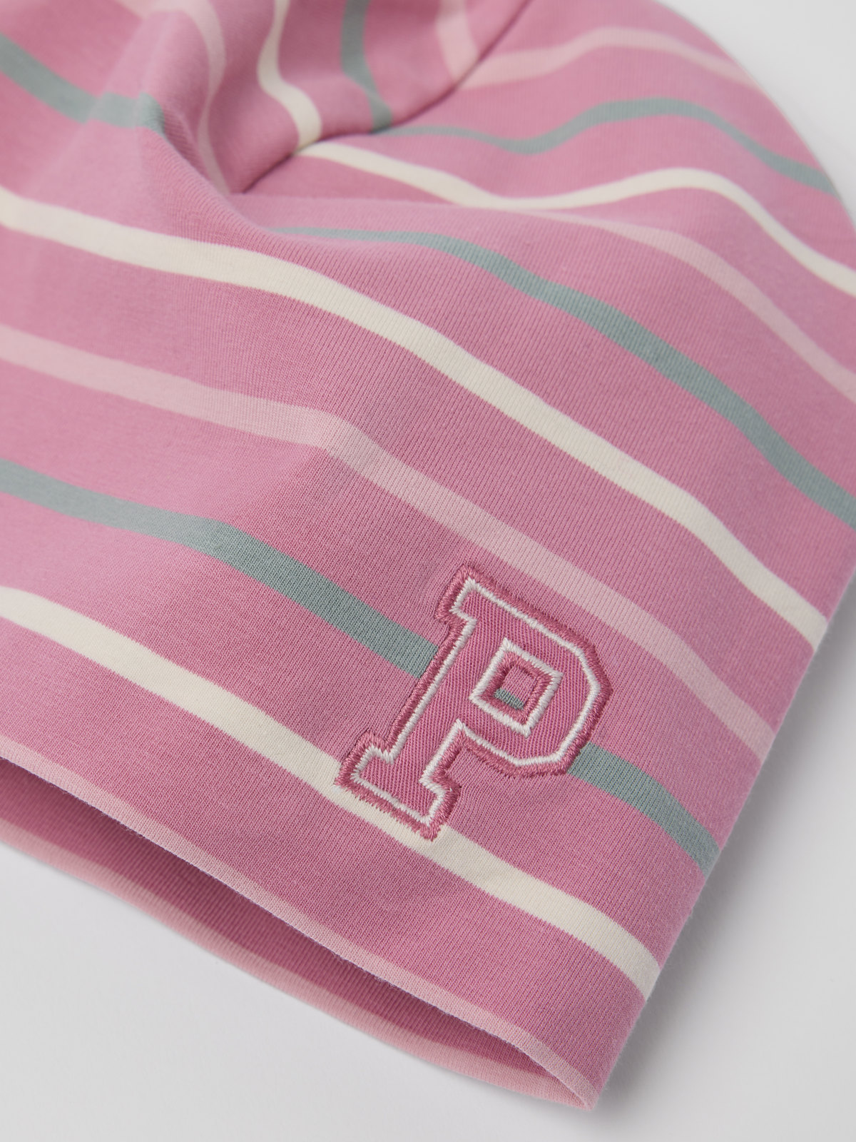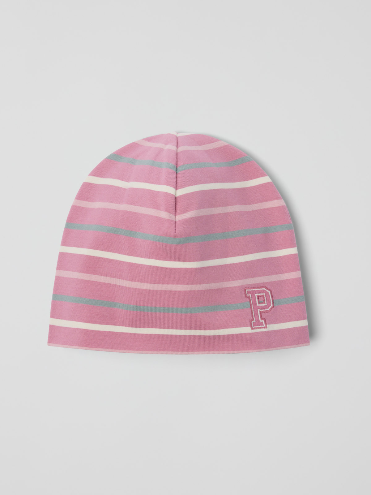 En tunn, multirandig trikåmössa i mjuk ekologisk bomull. Mössan har vår klassiska rand och är prydd med en P-applikation fram.