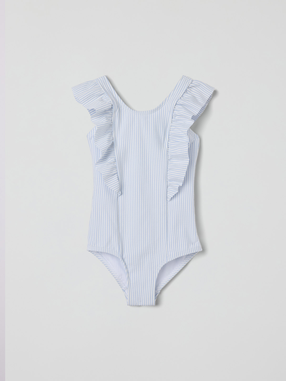 Randig baddräkt i mjukt och stretchigt material av 100 % återvunnen polyester. Baddräkten har breda axelband med söta volanger över axlarna.