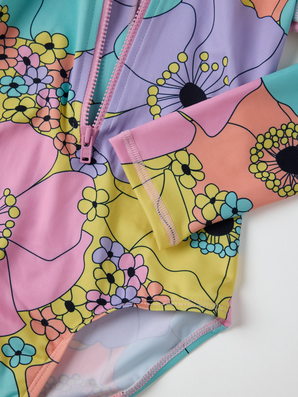 Långärmad baddräkt tillverkad i mjukt och skönt material av återvunnen polyester – perfekt för den som gillar att bada länge! Baddräkten har en smart dragkedja fram och är helmönstrad med blommor.