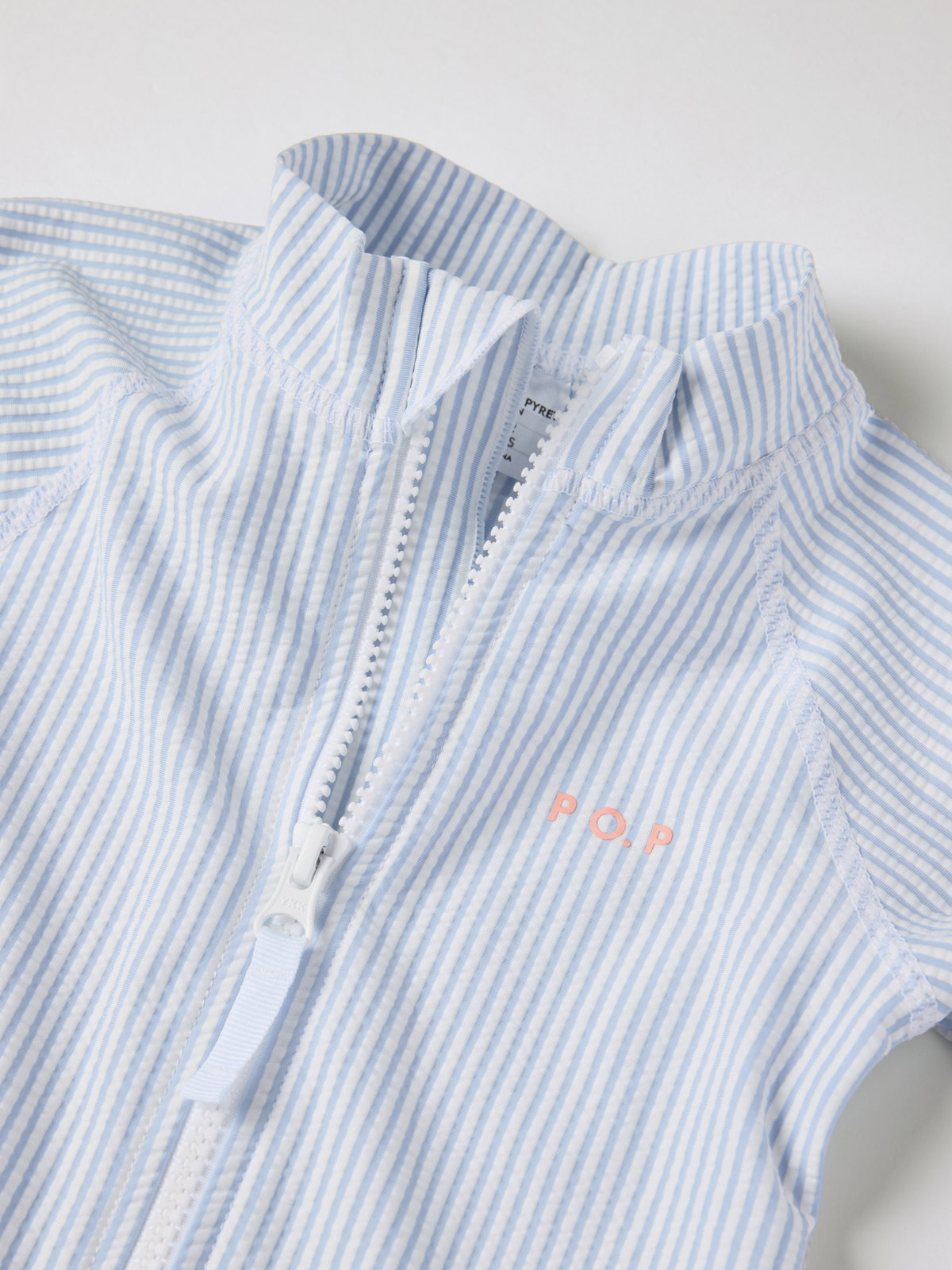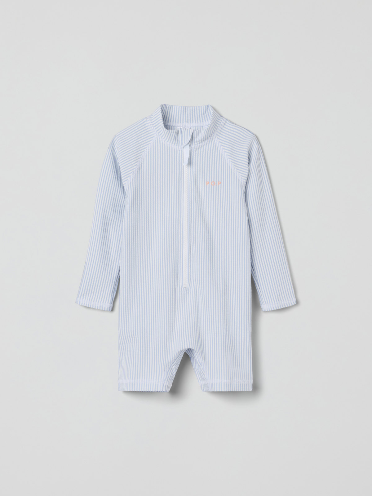Randig långärmad UV-dräkt med UPF 50, tillverkad i mjukt och skönt material av återvunnen polyester och sydd med extra mjuka sömmar som inte skaver. Dragkedjan fram gör den lätt att ta på och av och har ett skydd högst upp för att inte skava mot haka och kind.