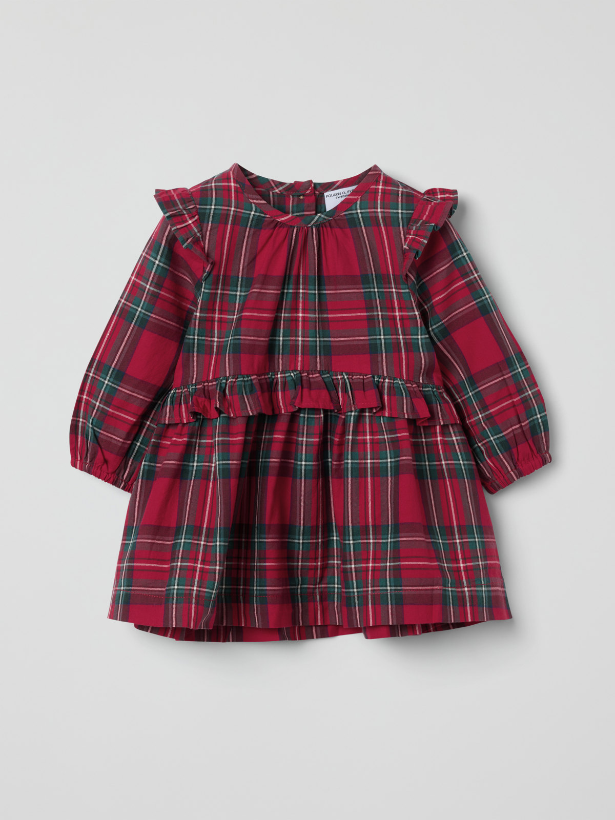 Söt twillklänning i 100% ekologisk bomull för baby – fin för alla tillfällen! Klänningen är prydd med volanger i midjan och över axlarna och stängs med knappslå bak på ryggen. Ärmarna har elastik i nederkant.