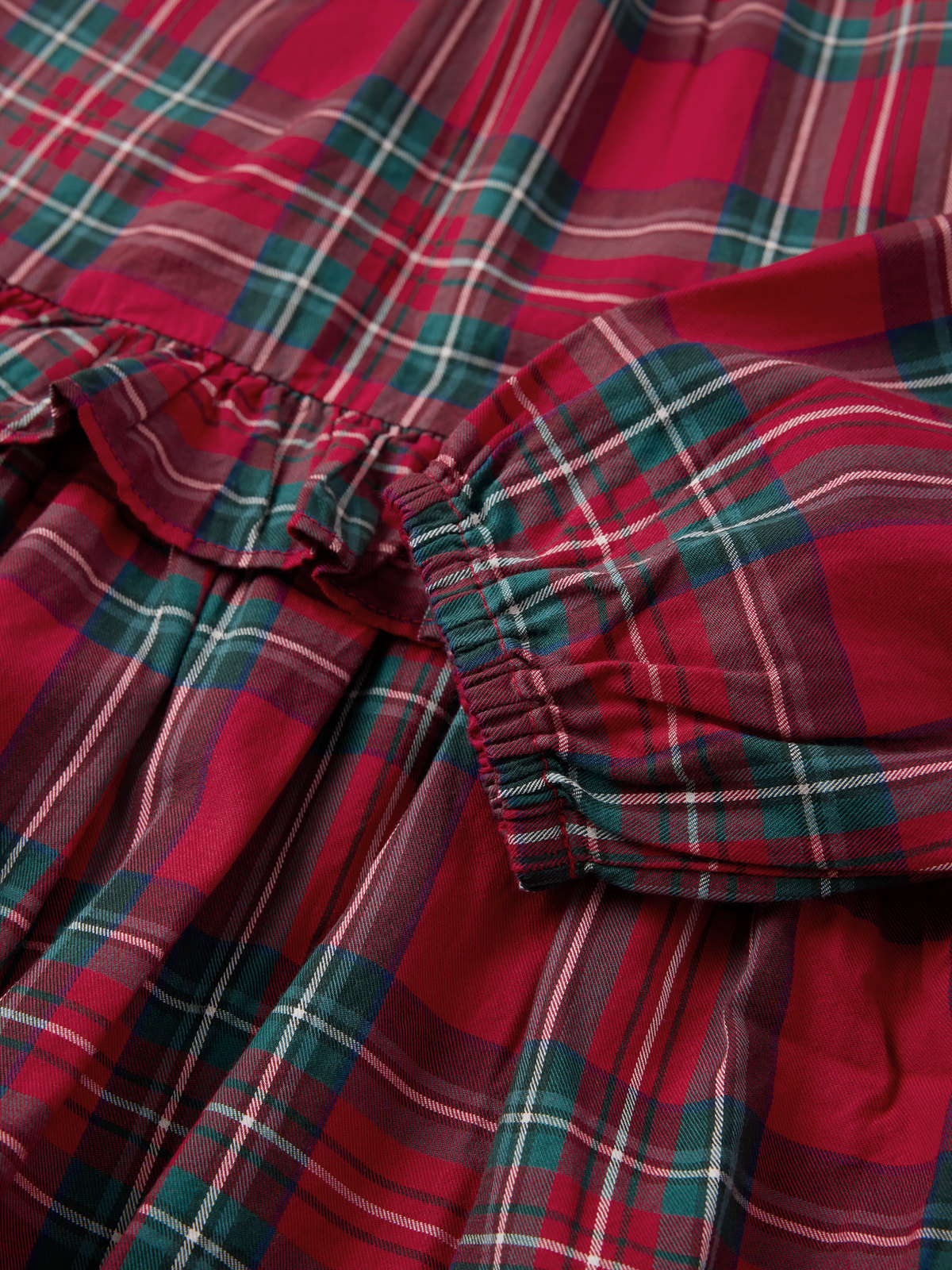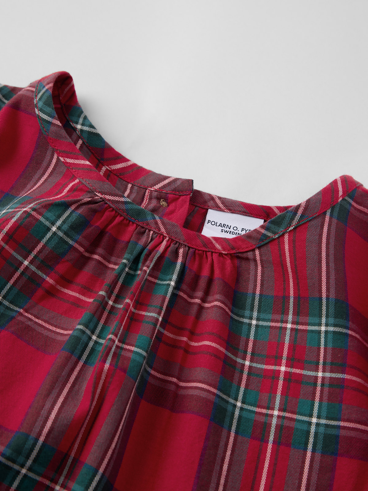 Söt twillklänning i 100% ekologisk bomull – fin för alla tillfällen! Klänningen är prydd med volanger i midjan och över axlarna och stängs med knappslå bak på ryggen. Ärmarna har elastik i nederkant.