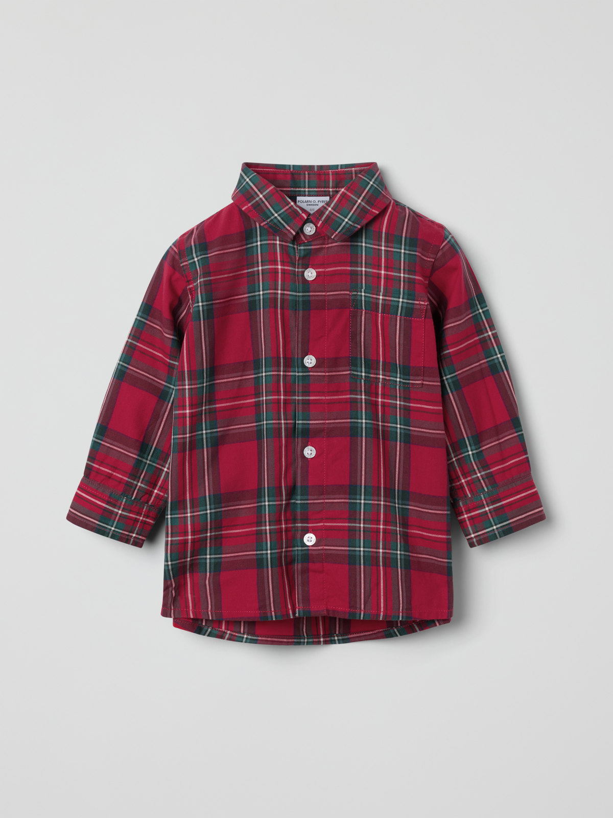 Rutig skjorta i vävd kvalitet i 100 % ekologisk bomull för baby – perfekt för festliga tillfällen! Skjortan har en bröstficka, samt ett ok med motveck i ryggen.