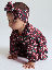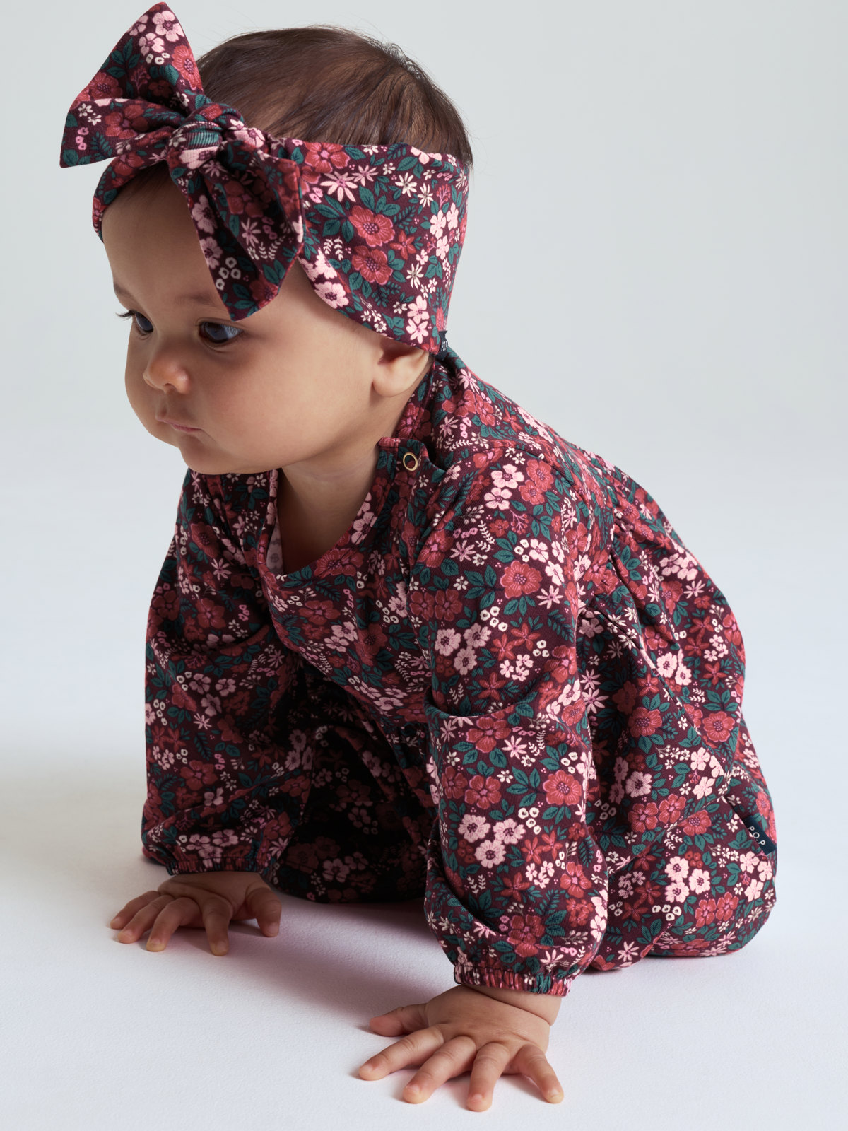 Elastiskt hårband i mjuk ekologisk bomullstrikå. Hårbandet är helmönstrat med blommor och prytt med fin rosett.