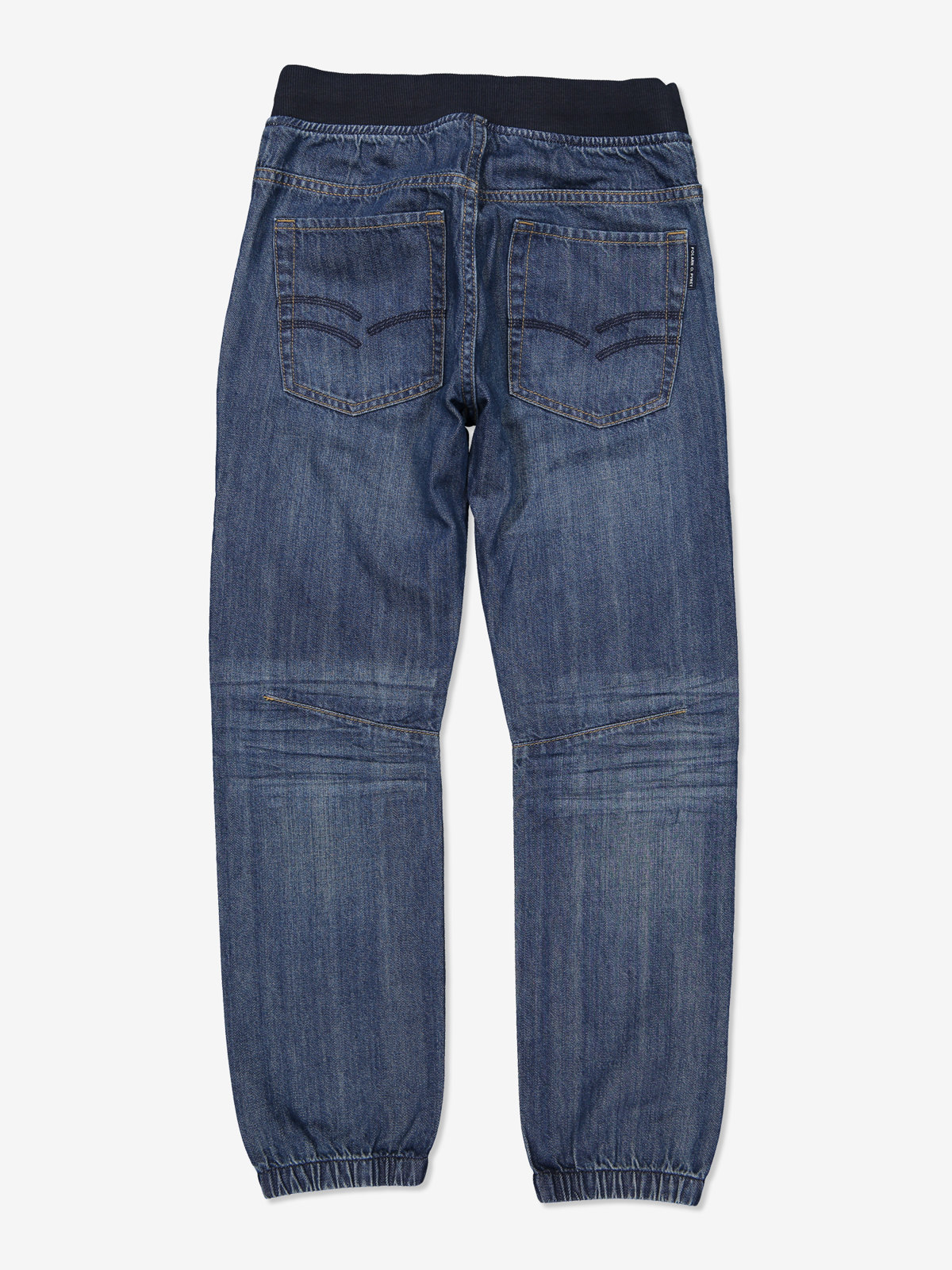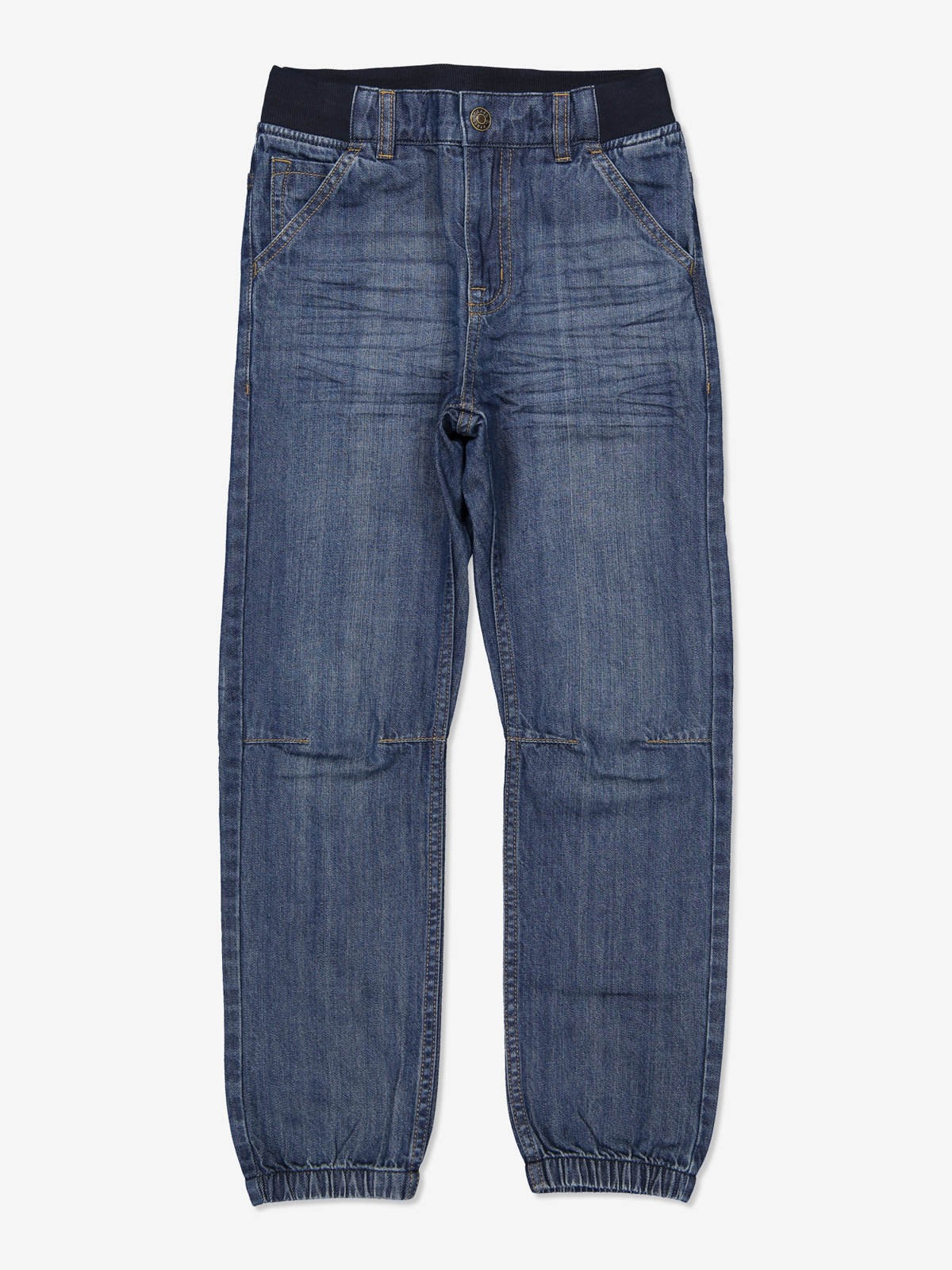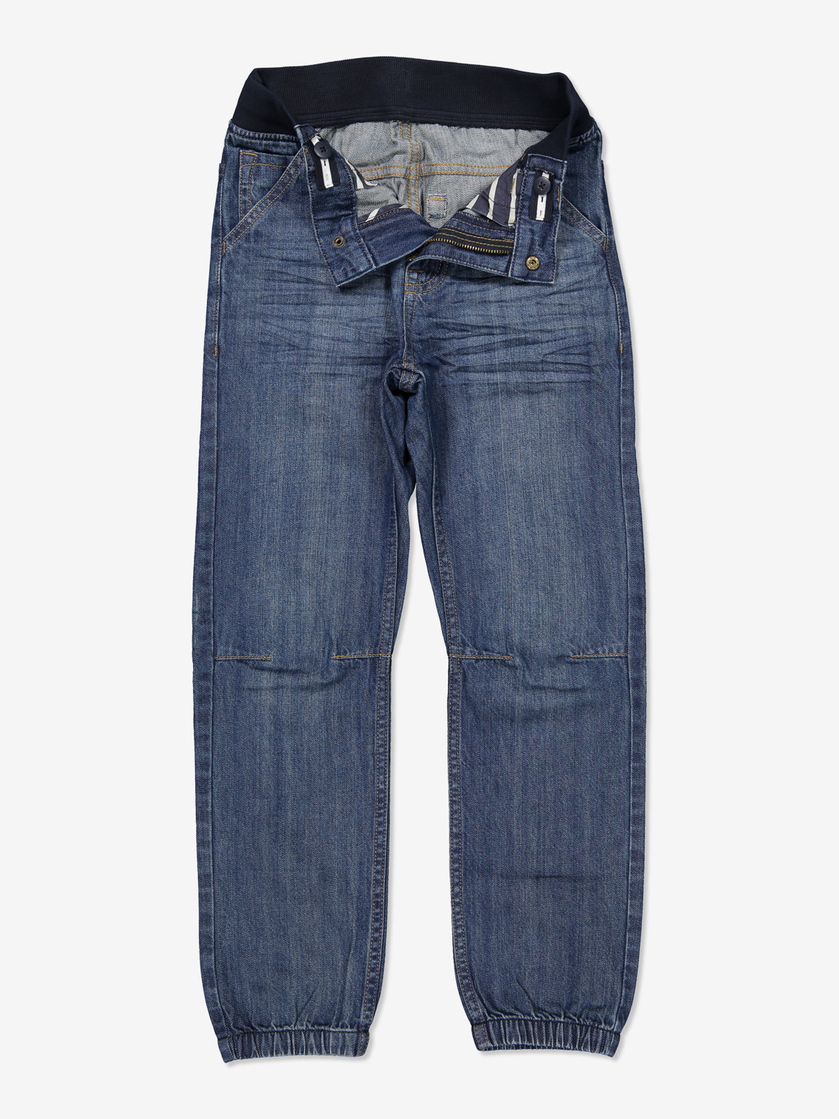 Mjuka jeans i en avslappnad modell, med två sidfickor, och två fickor bak. Midjan går att regleras på insidan med knapphålsresår. De förböjda knäna och resåren vid de båda bensluten ger en perfekt passform. Gylfen stängs med tryckknapp och dragkedja.