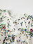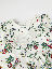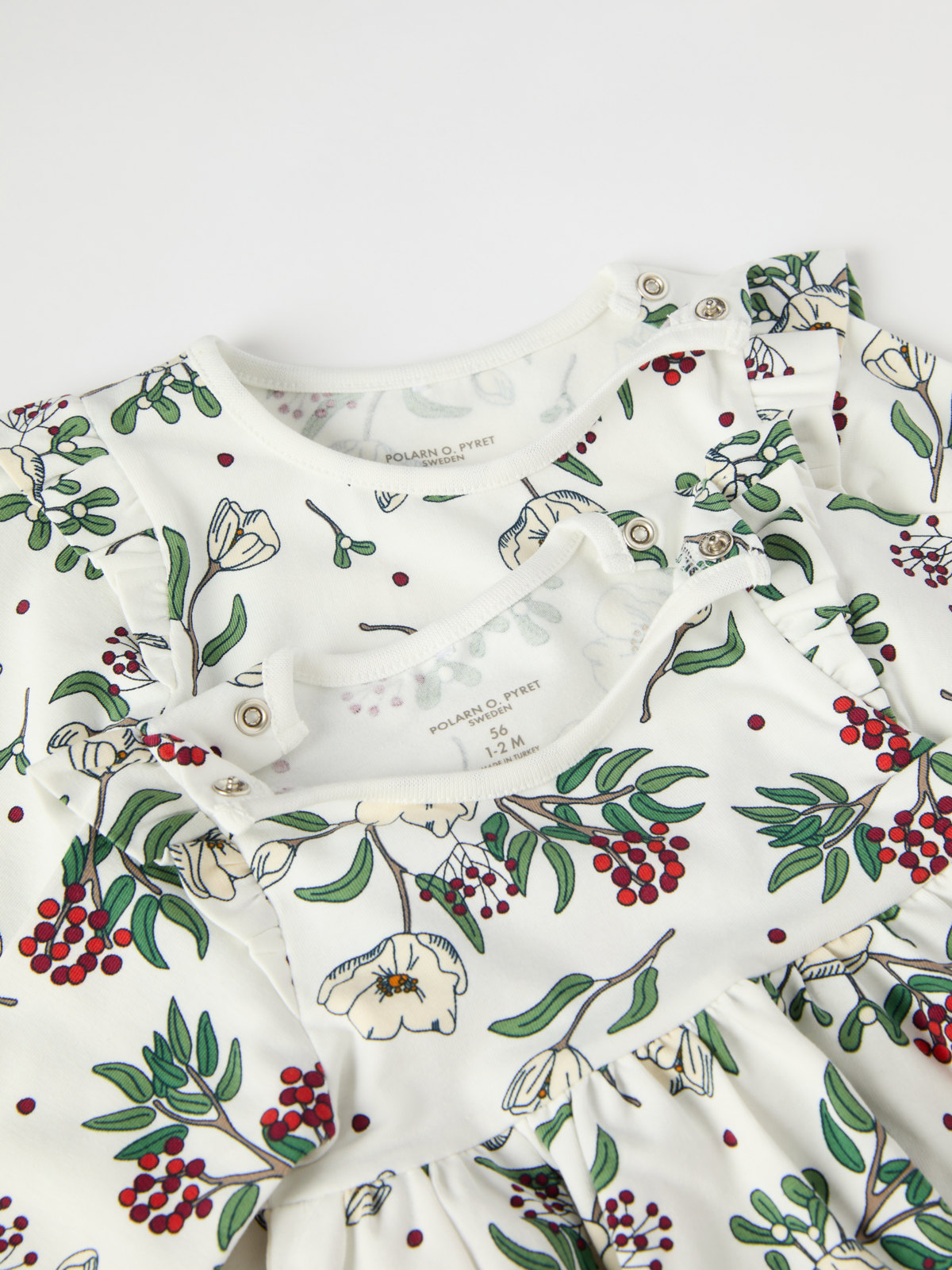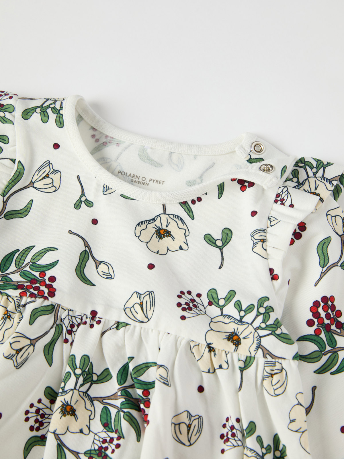Söt klänning i mjuk ekologisk bomullstrikå. Klänningen är helmönstrad med blommor och prydd med volanger över axlarna.