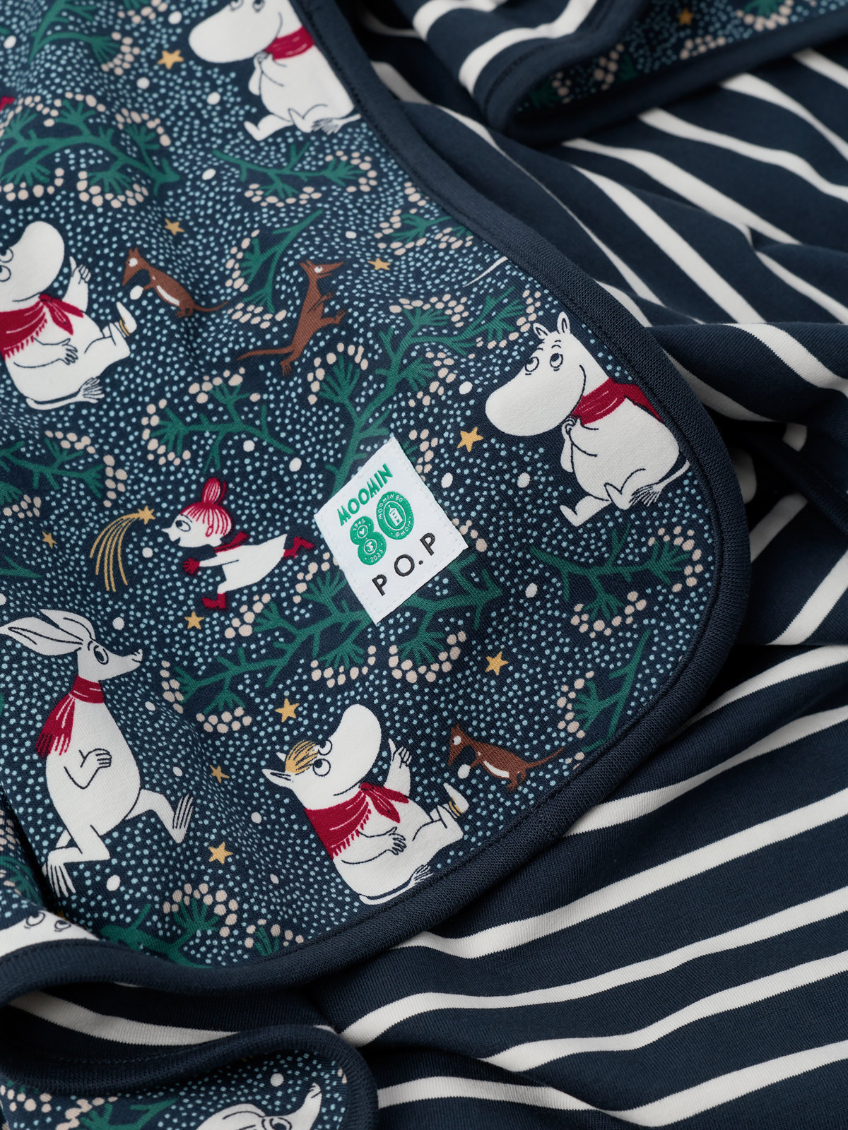 Mjuk och skön babyfilt i ekologisk bomull – en del av vårt älskade designsamarbete för att fira Mumins 80-årsjubileum 2025. Filten är helmönstrad med illustrationer från Tove Janssons berättelser om mumintrollen.