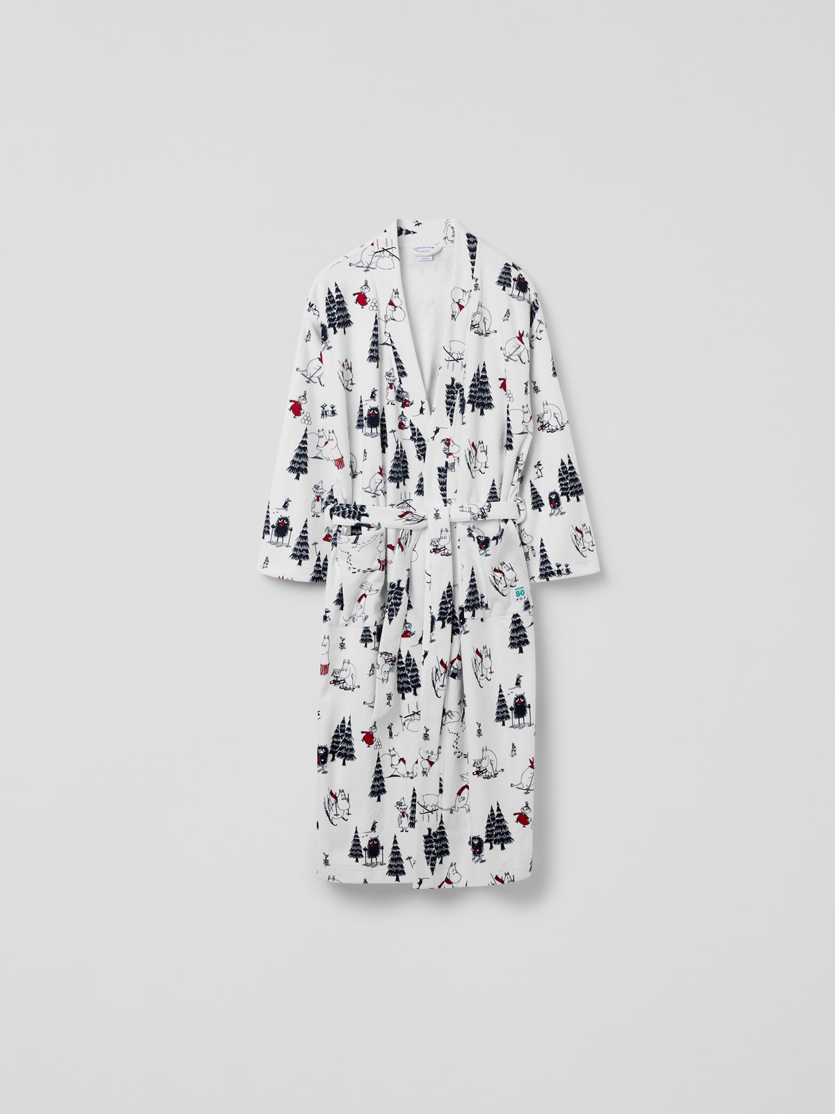 Morgonrock i tunn och mjuk frotté av ekologisk bomull och återvunnen polyester för vuxen – en del av vårt älskade designsamarbete för att fira Mumins 80-årsjubileum 2025. Morgonrocken är helmönstrad med illustrationer från Tove Janssons berättelser om mumintrollen. Den har två stora fickor fram och stängs med knytband.