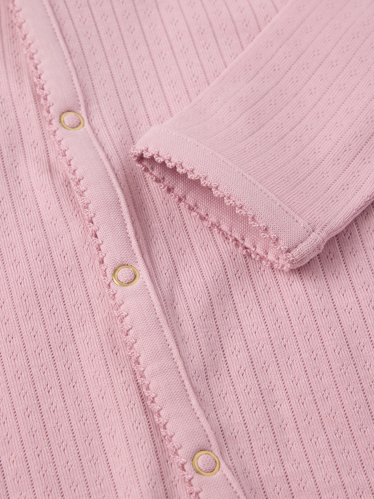 Pyjamasoverall i mjuk pointeille av Tencel™ lyocell och ekologisk bomull sydd med extra mjuka, platta sömmar som är skonsamma mot känslig hud. Overallen har raka ärmar och mudd i benslut för skön passform. Den långa knappslån från hals till benslut underlättar klädbyten.