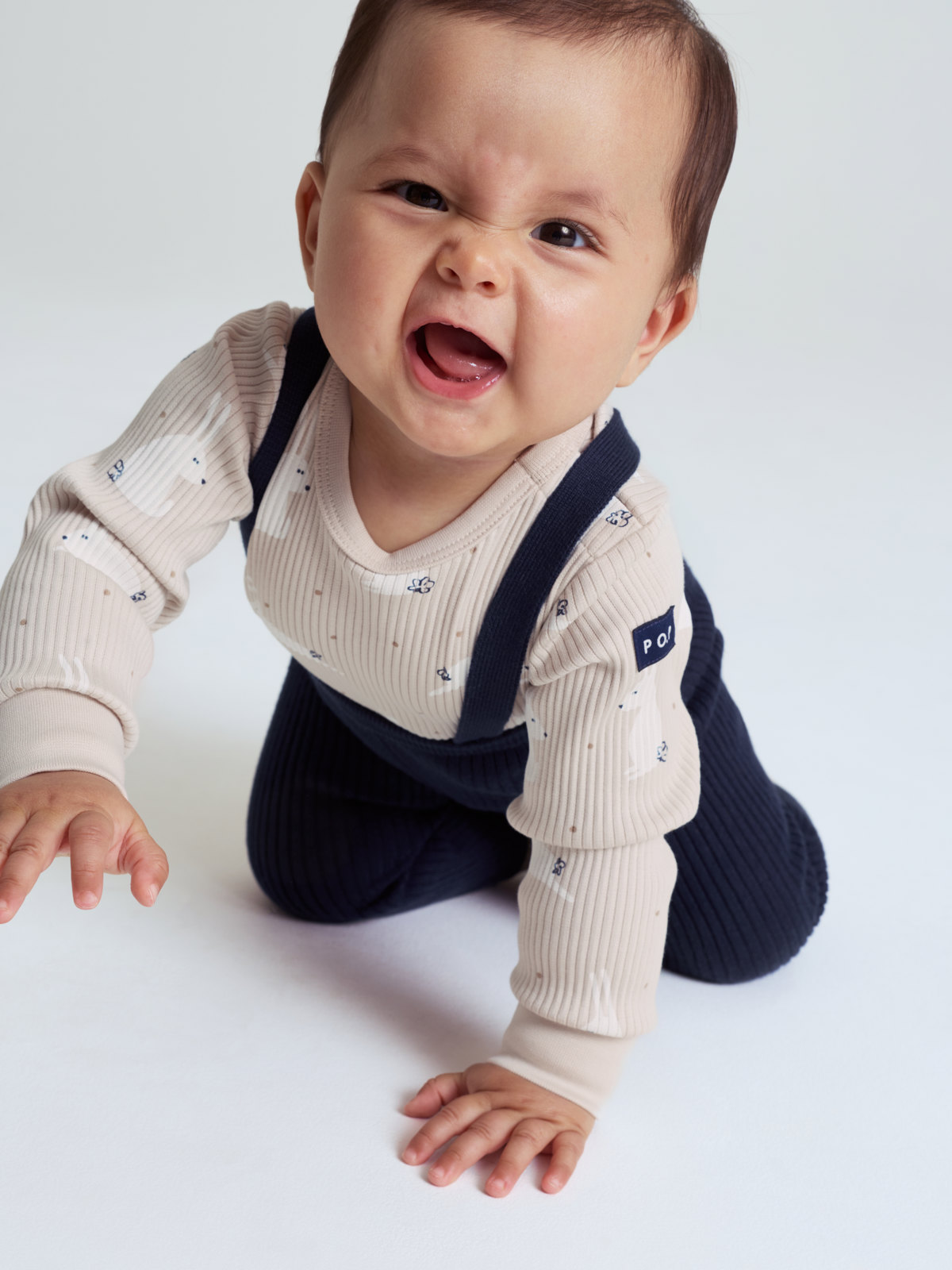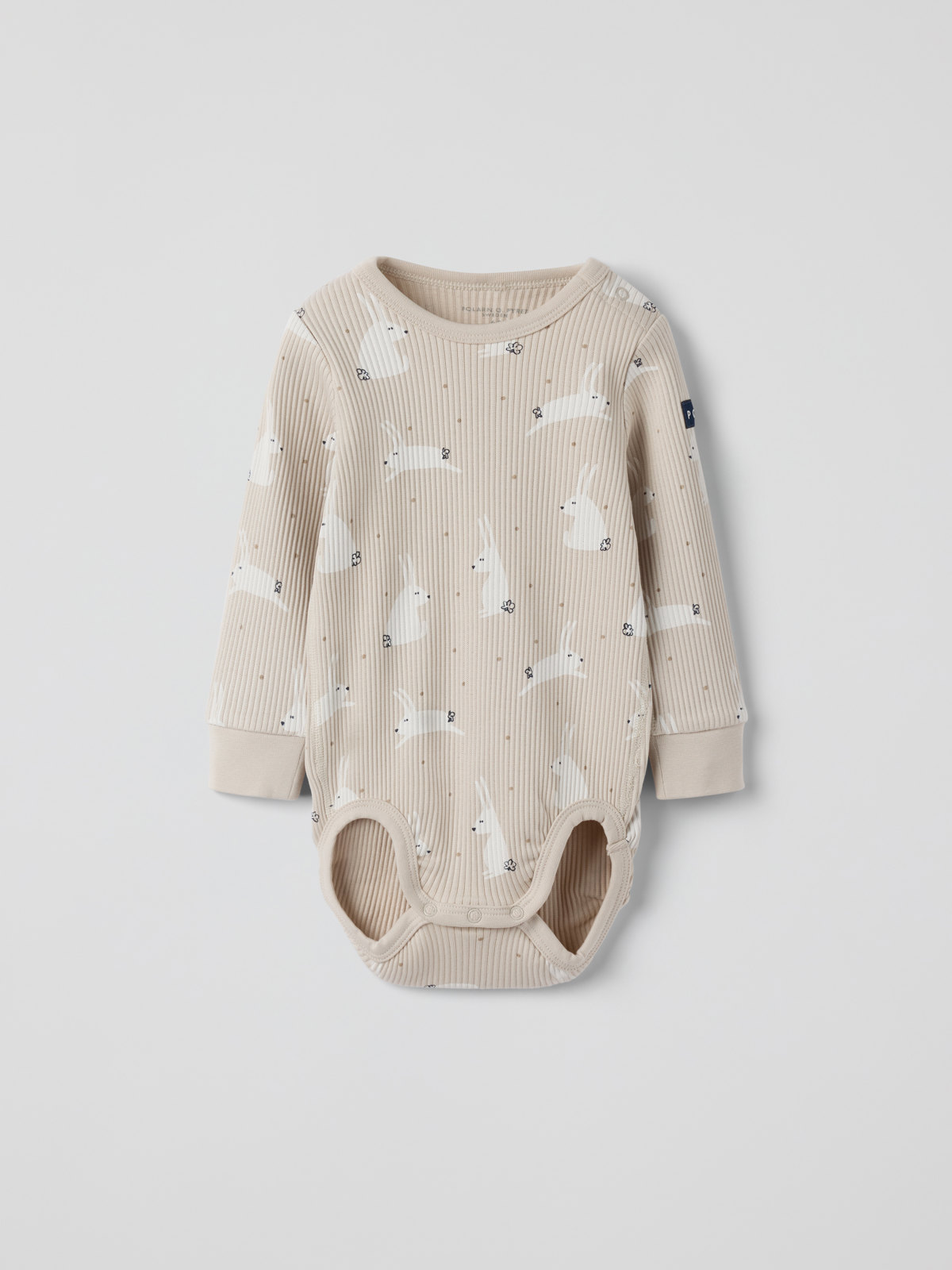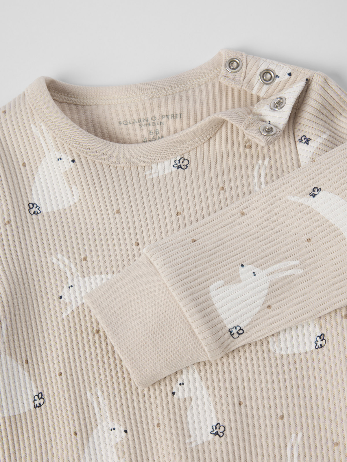 Ribbad body i mjuk ekologisk bomull för baby. Bodyn är sydd med extra mjuka, platta sömmar som inte skaver mot känslig hud.