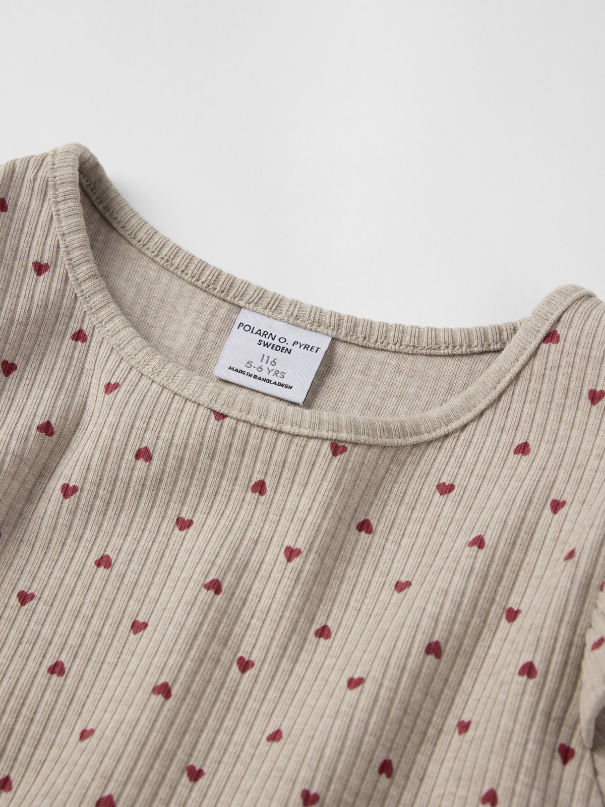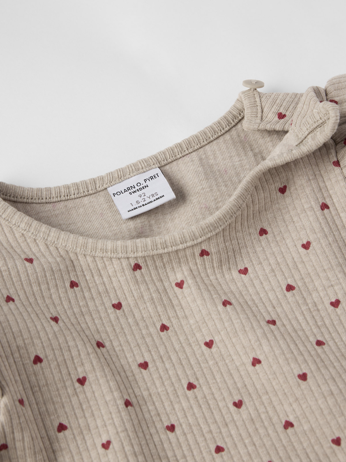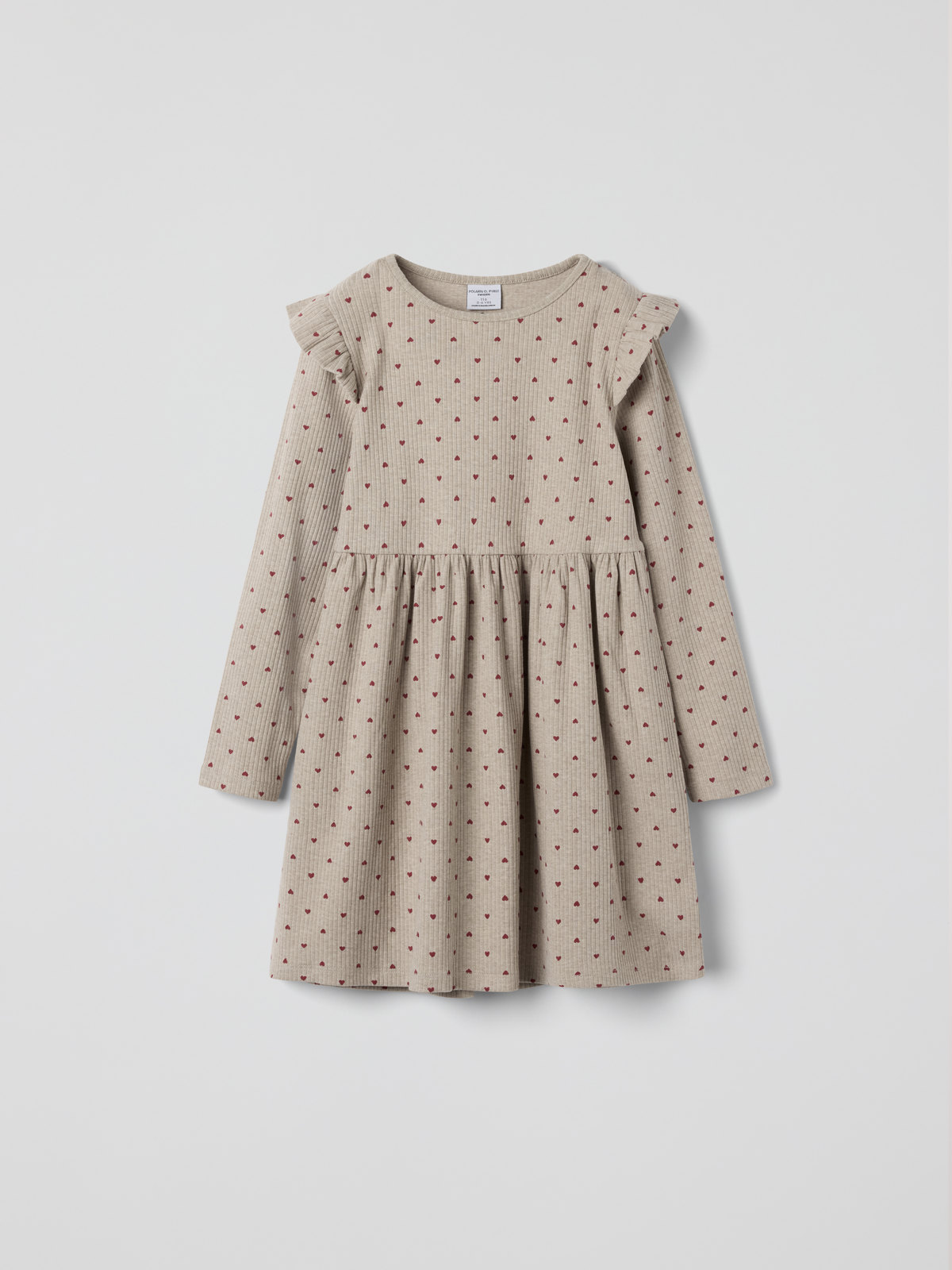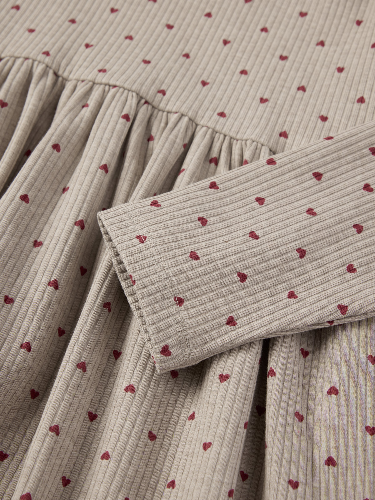 Mjuk ribbad klänning i ekologisk bomull för baby. Klänningen helmönstrad med små hjärtan och prydd med små volanger över axlarna.