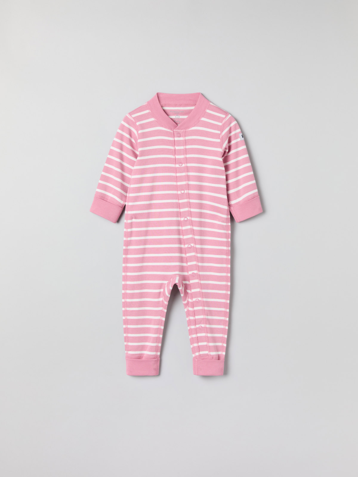 Randig pyjamasoverall i mjuk ekologisk bomull för baby, sydd med extra mjuka sömmar som inte skaver.