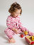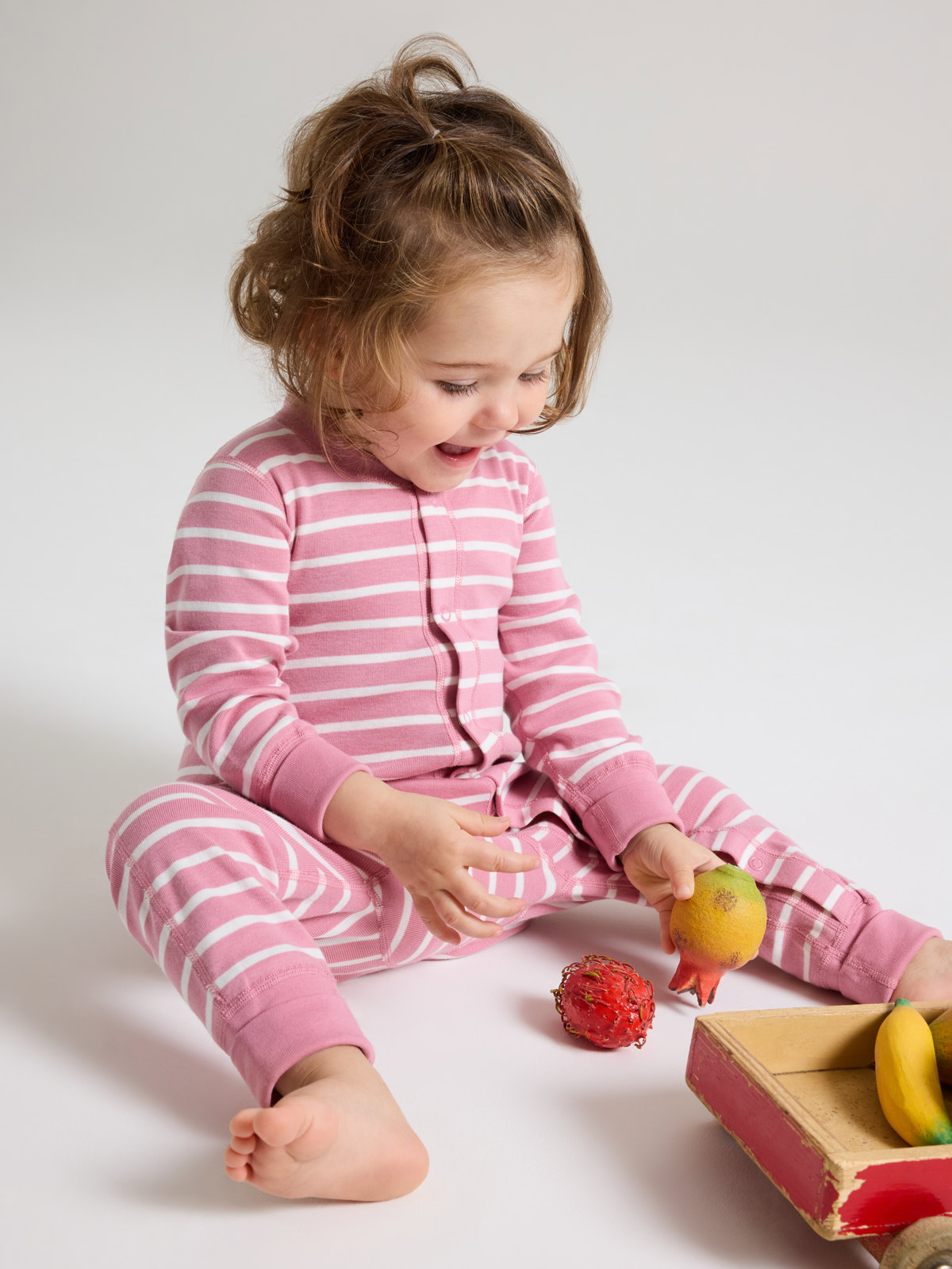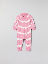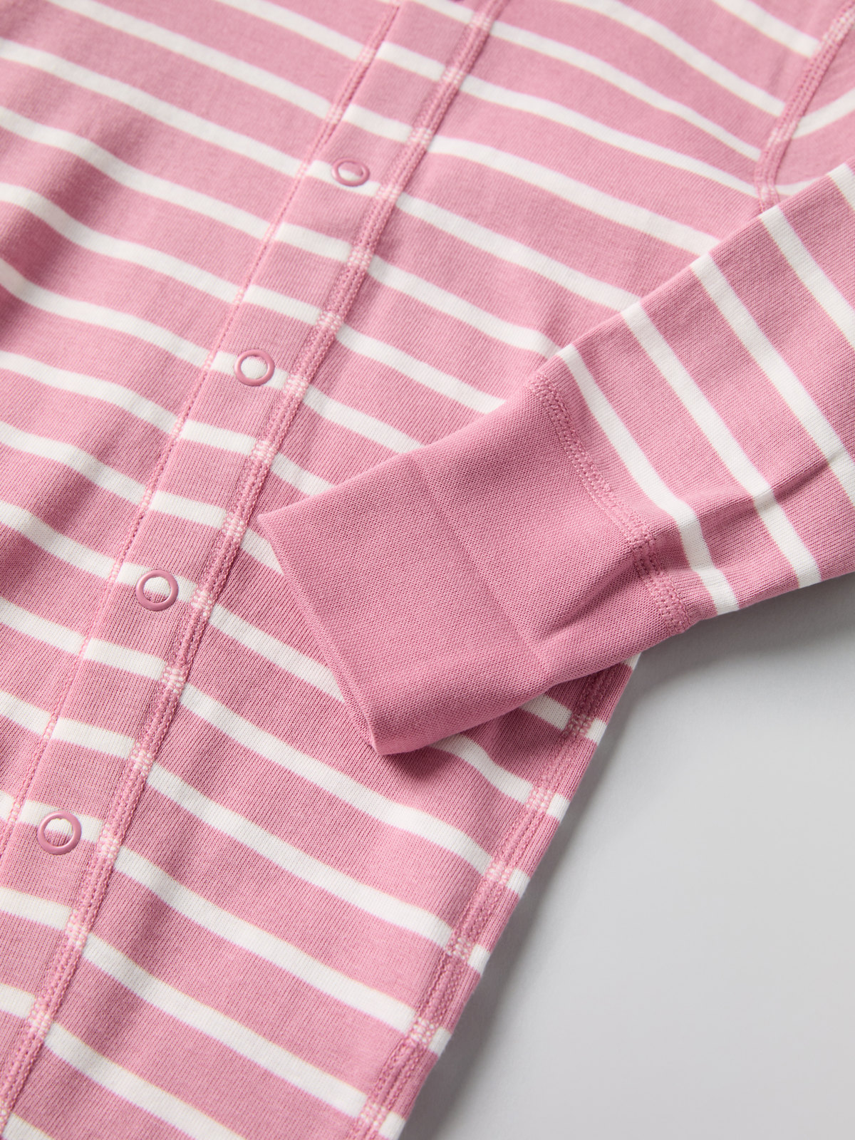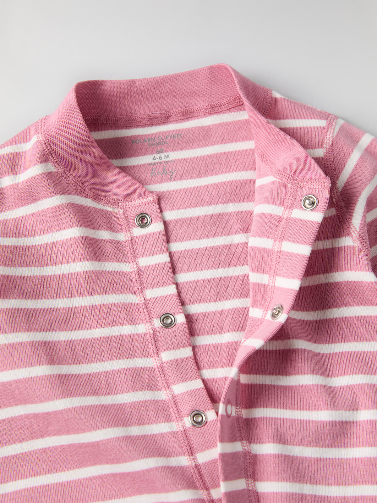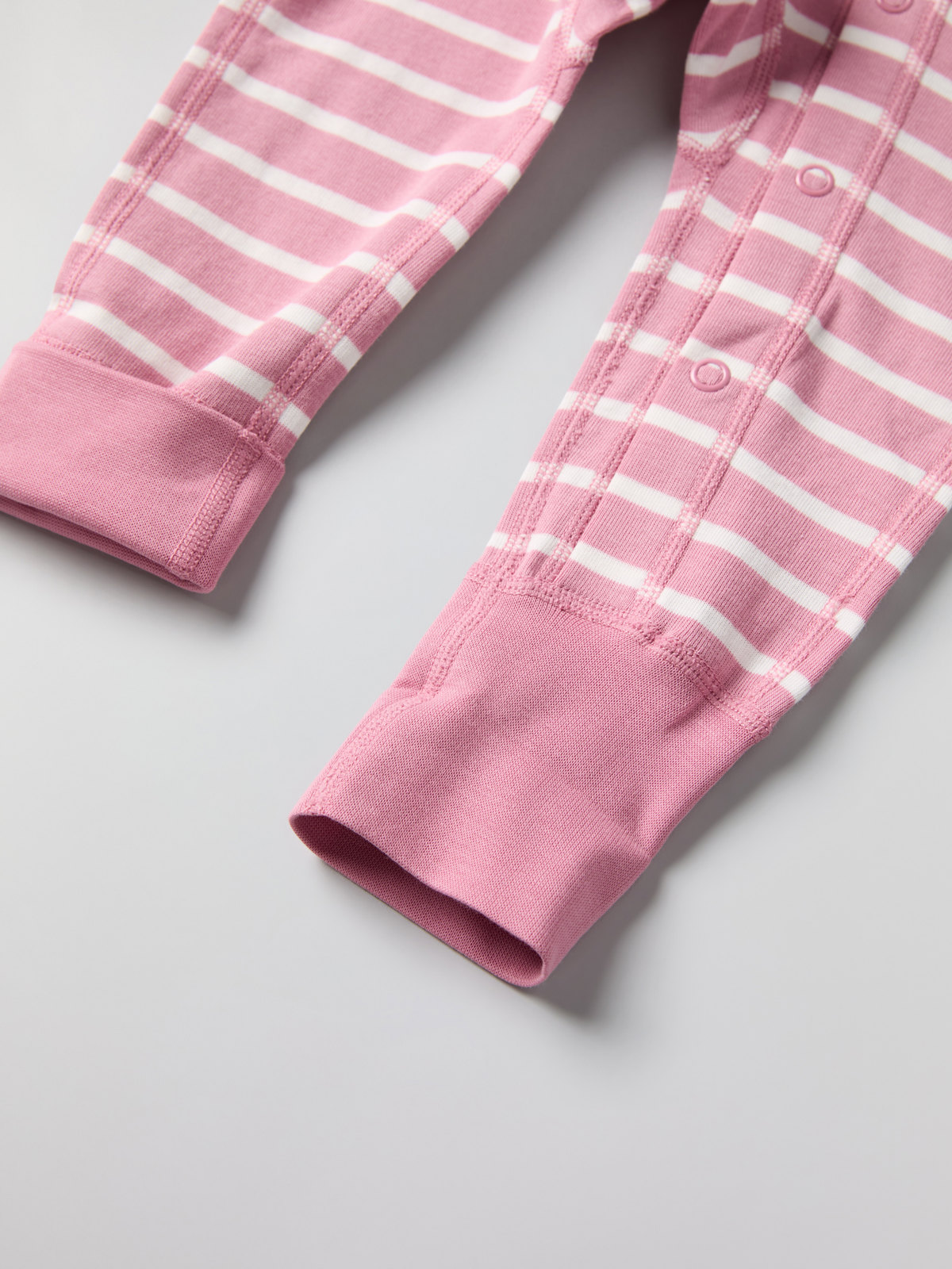 Muddarna vid ärm- och bensluten är extra långa, och går att vika ned allt eftersom barnet växer. Tryckknapparna från hals till benslut förenklar klädbyten.