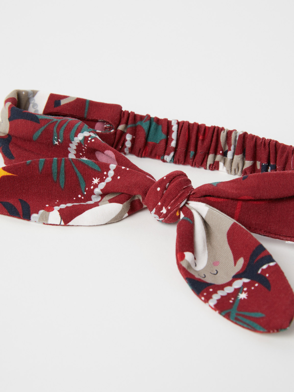 OBS! Den här produkten har ett fabrikationsfel. Elastiskt hårband i mjuk ekologisk bomullstrikå med härligt julmönster och fin rosett.