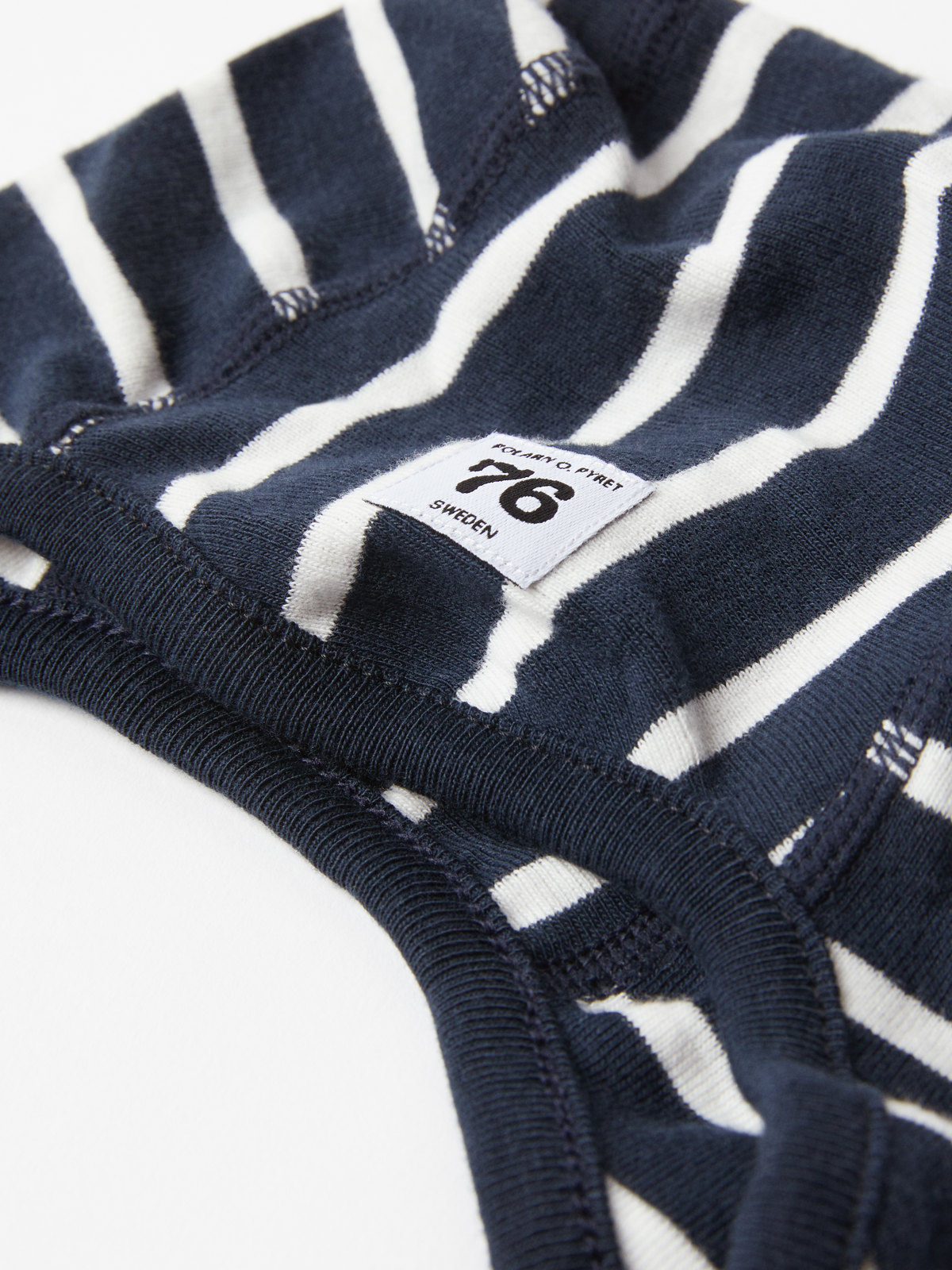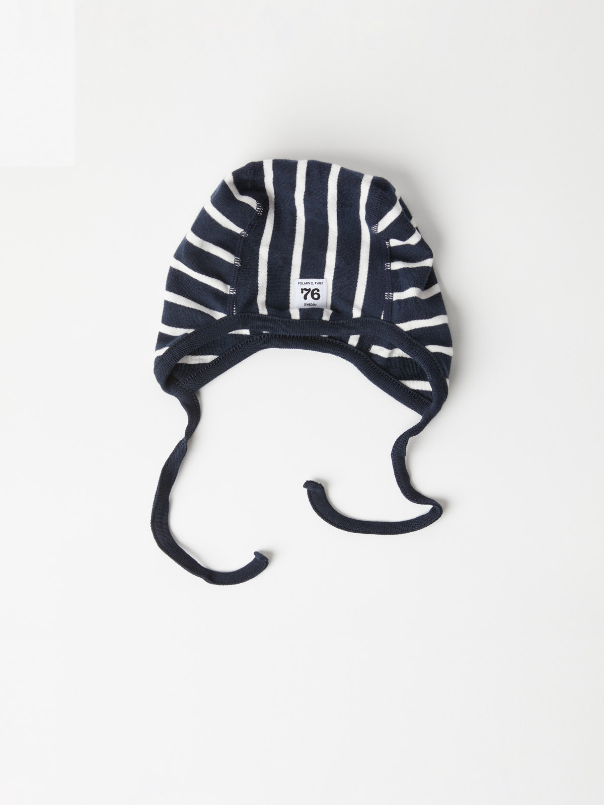 Randig hjälmmössa i 100% ekologisk bomull för nyfödd. Mössan har vår klassiska rand och knytband under hakan som håller mössan på plats.