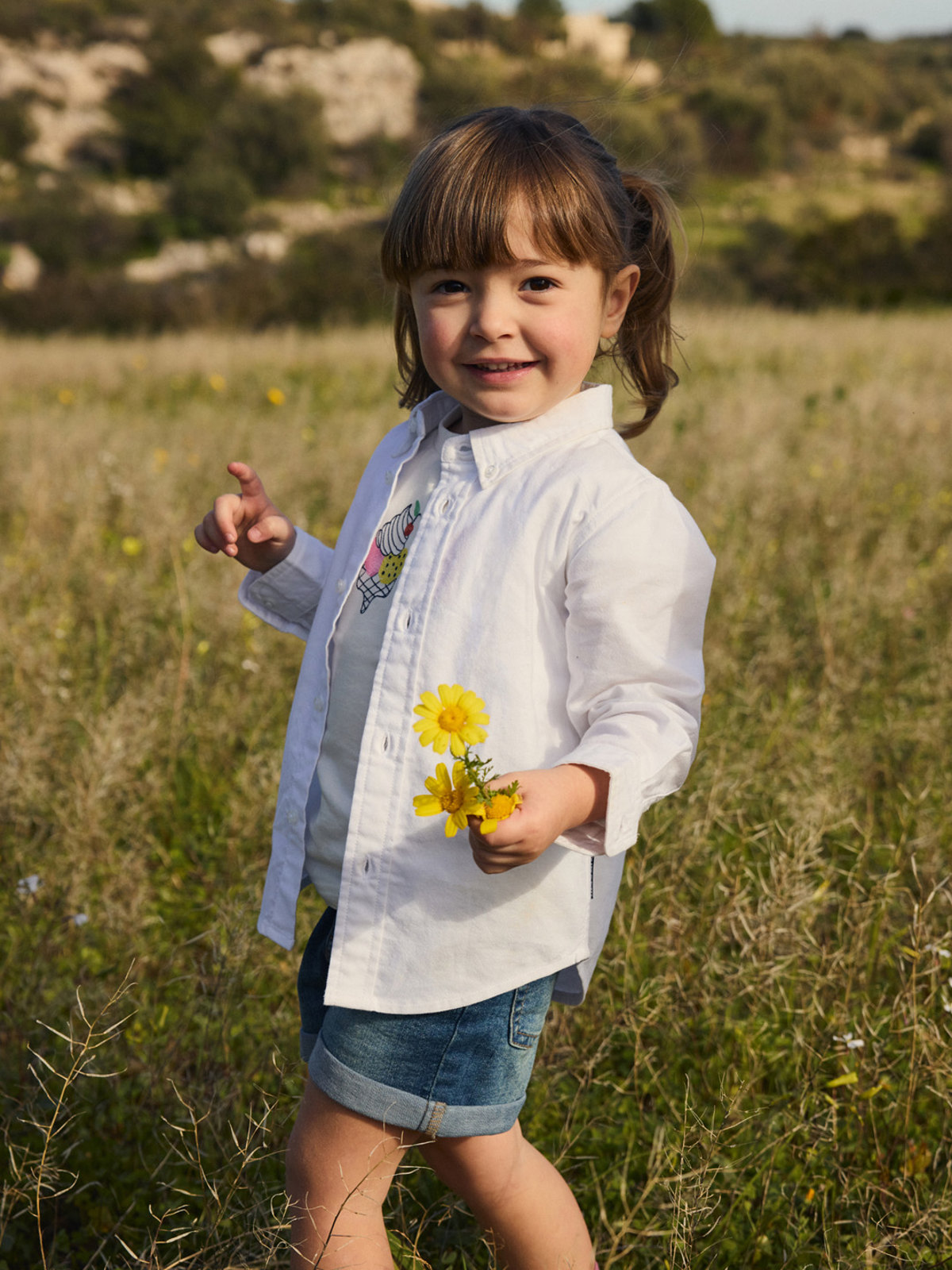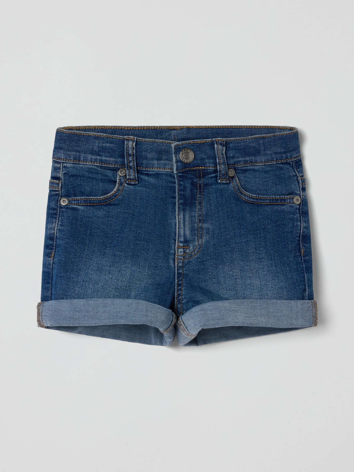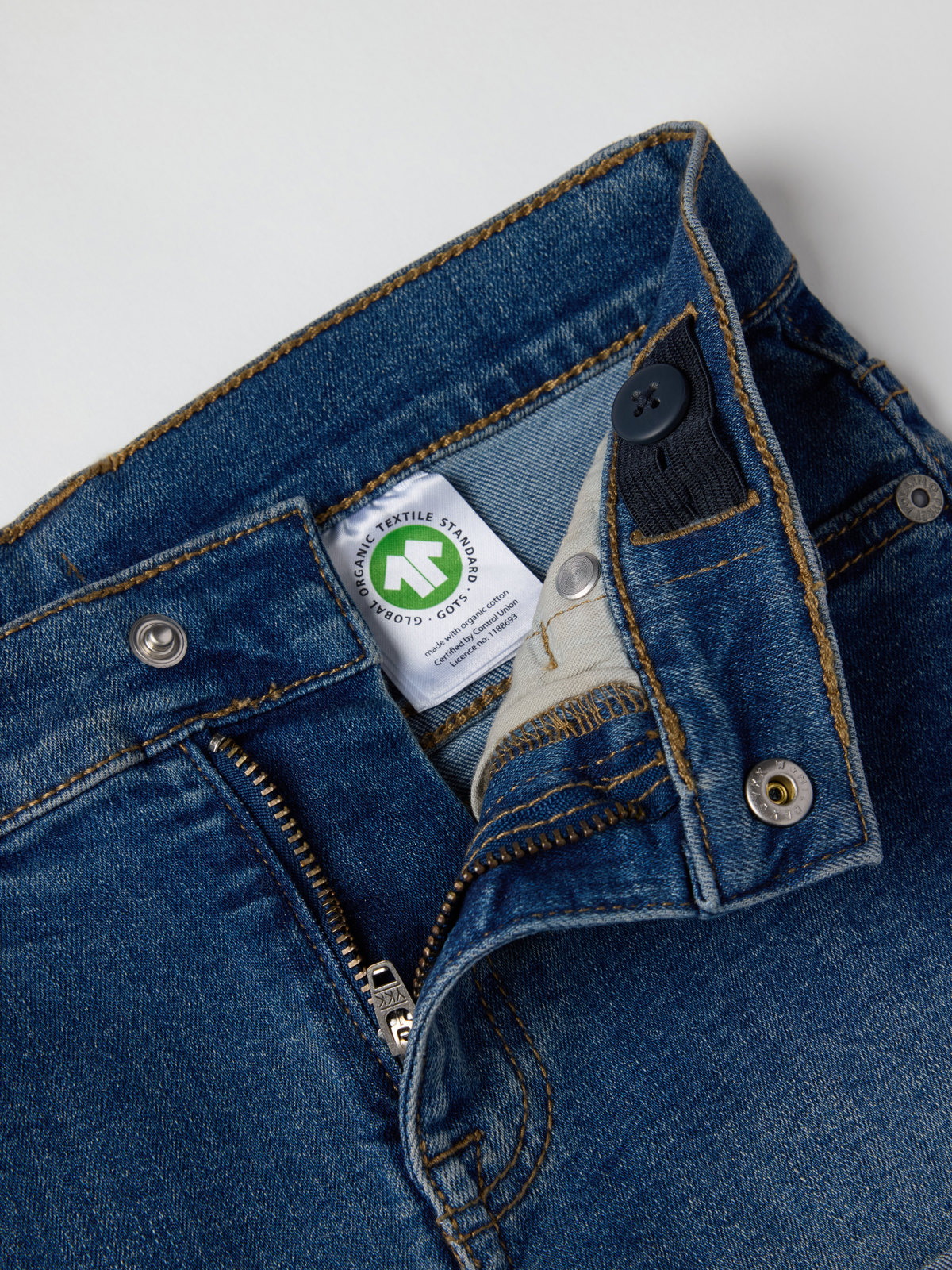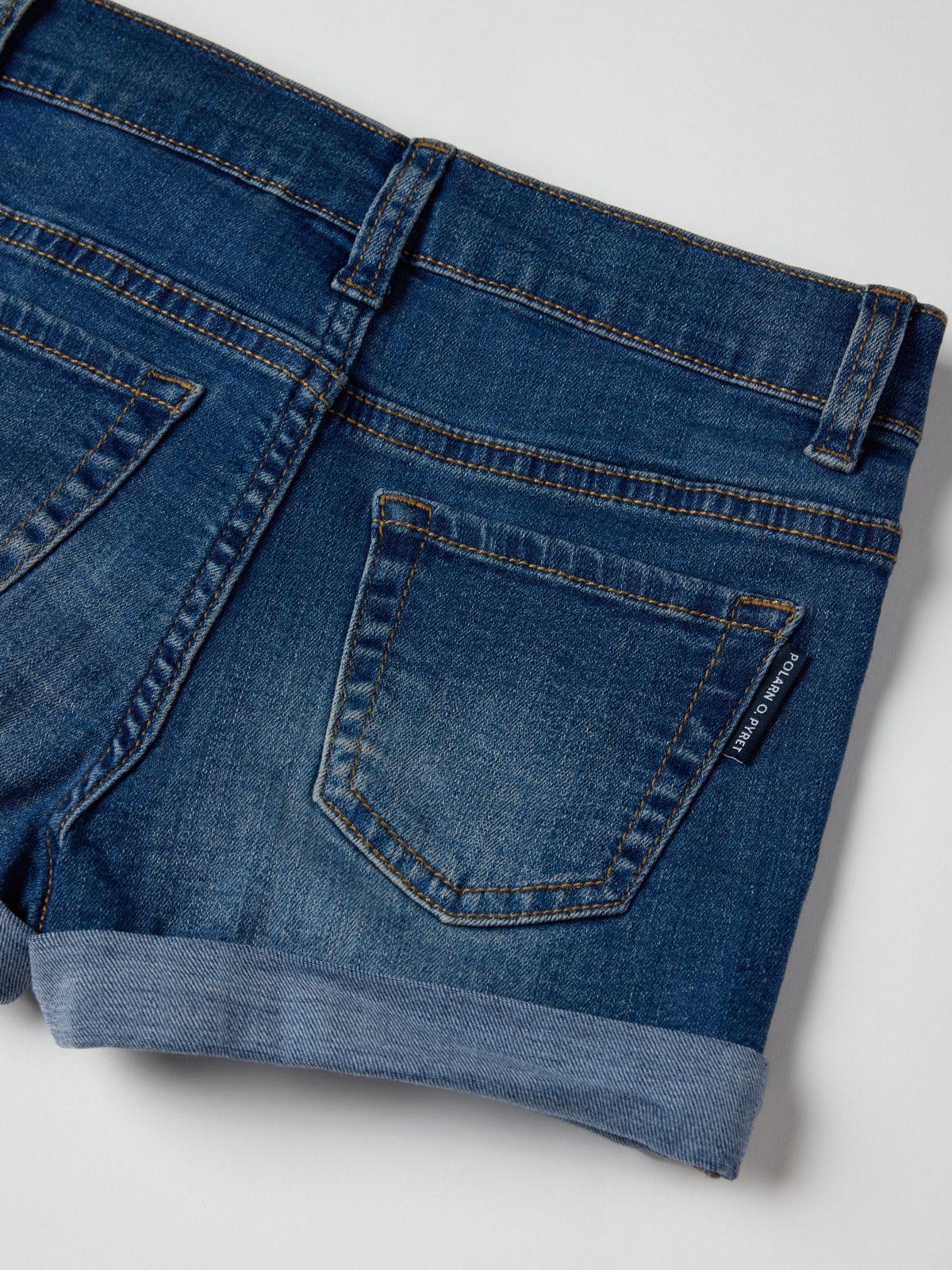 Korta jeansshorts i 100 % ekologisk bomull med reglerbar midja och hällor för skärp. Shortsen har uppvikt benslut. Gylfen stängs med tryckknapp och dragkedja.
