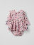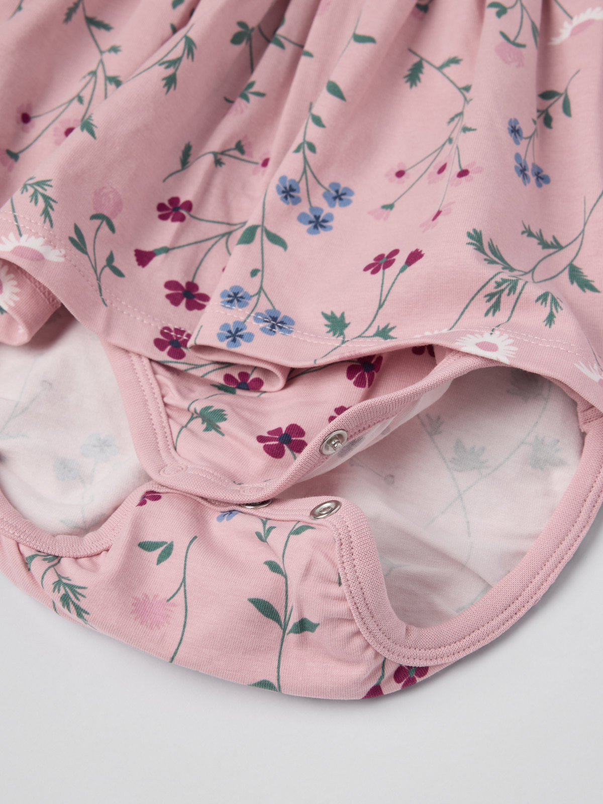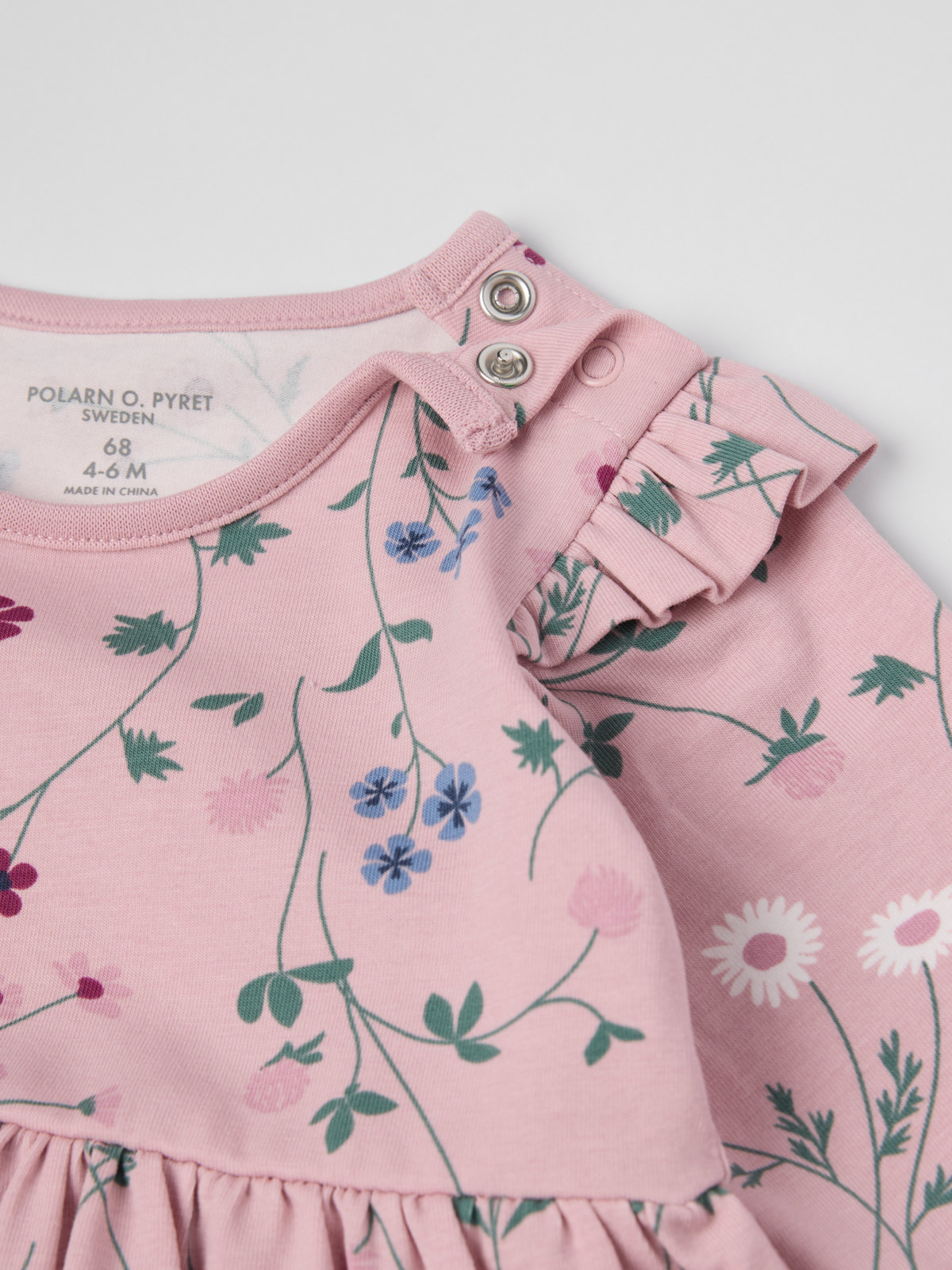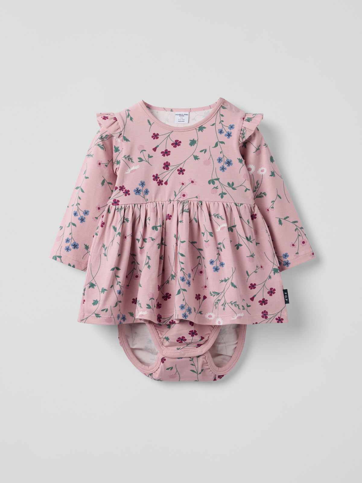 En praktisk kombination av klänning och body i mjuk ekologisk bomull för baby. Klänningen är blommönstrad och prydd med fina volanger över axlarna. Tryckknappar på ena axeln och i grenen underlättar klädbyten.