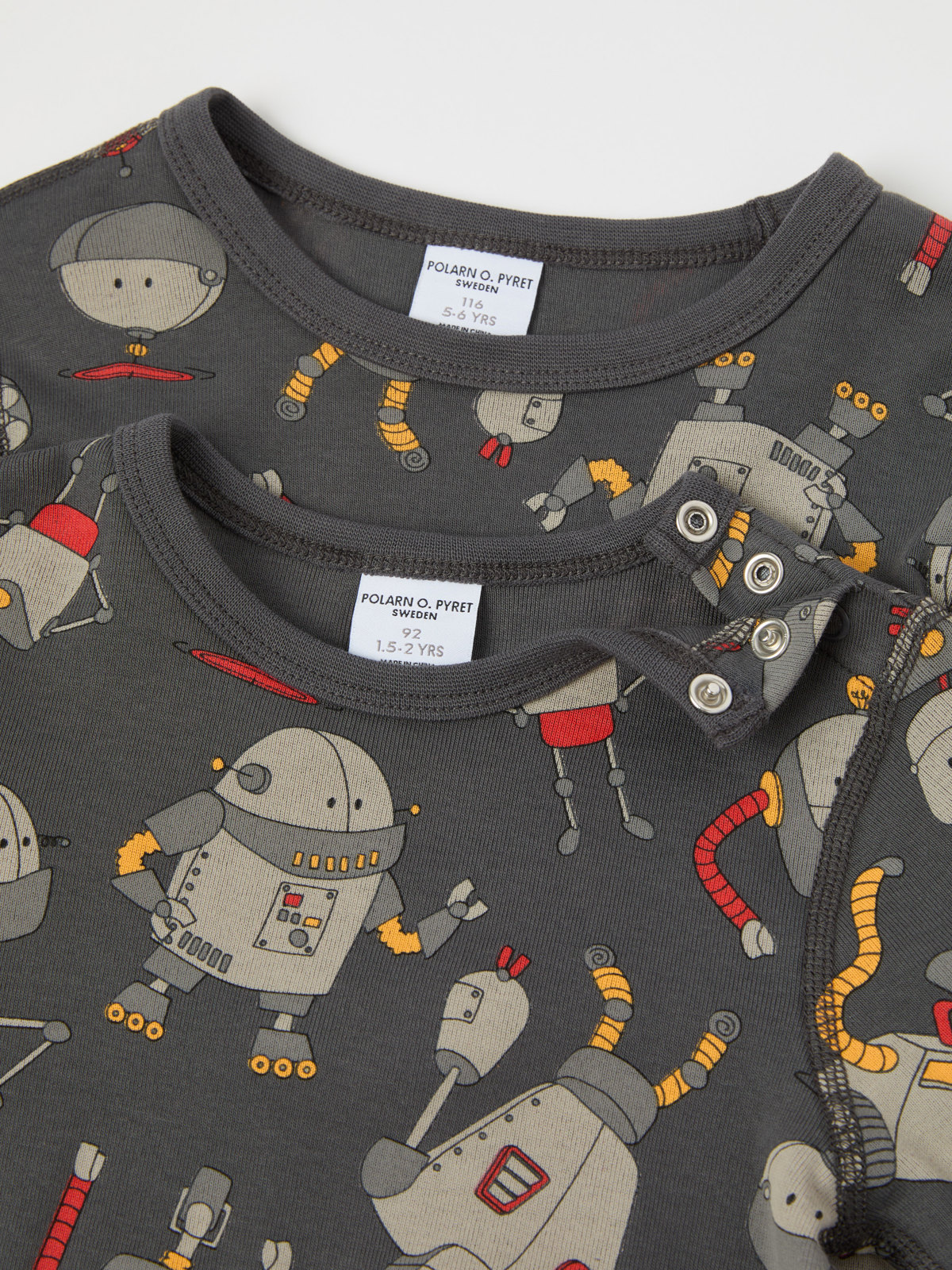 Storlekarna 86-92 har tryckknappar bak på ena axeln för att underlätta klädbyten.