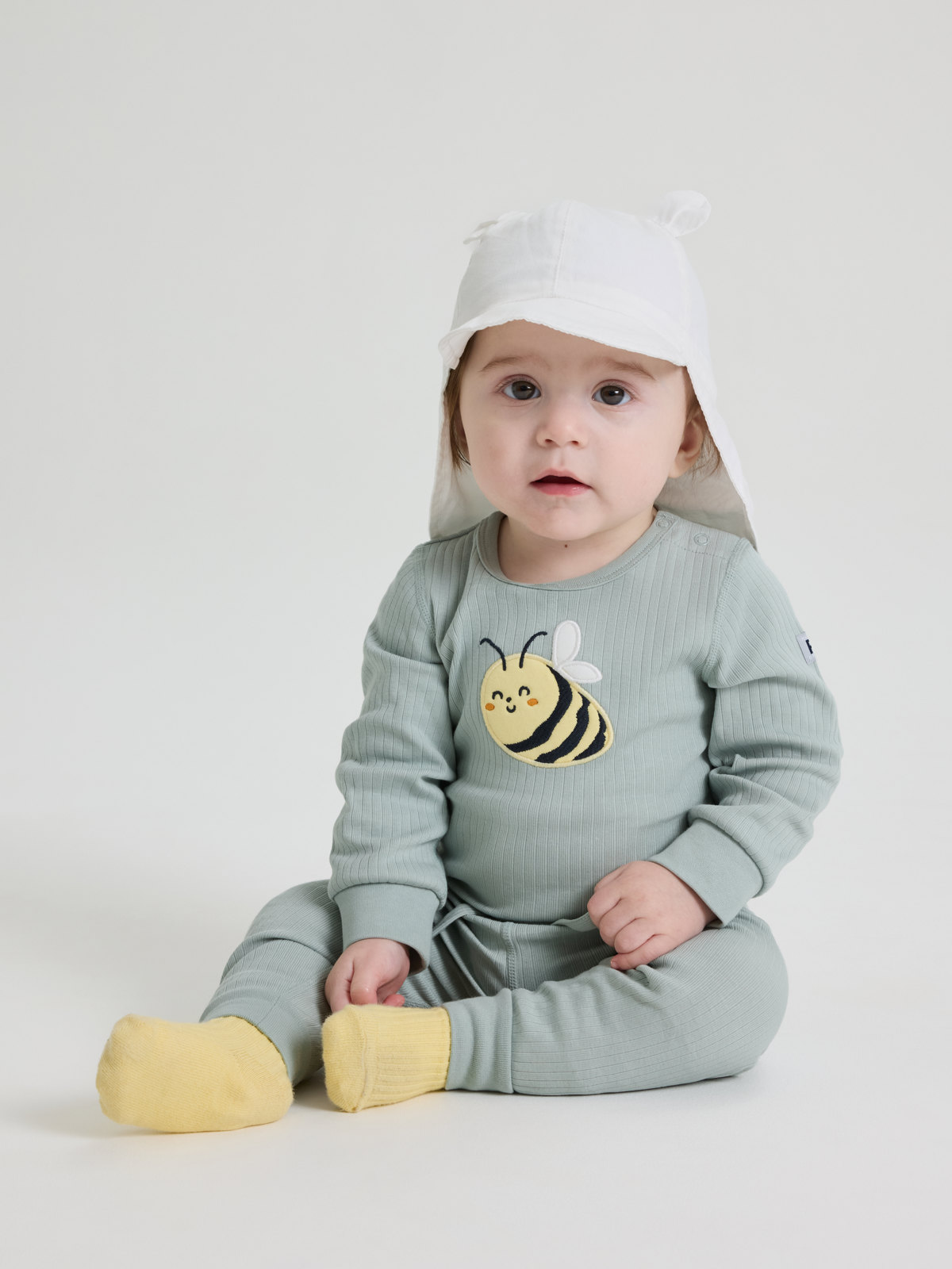 Ribbad body i mjuk ekologisk bomull för baby. Bodyn har en söt biapplikation på framstycket och är sydd med extra mjuka, platta sömmar som inte skaver mot känslig hud.
