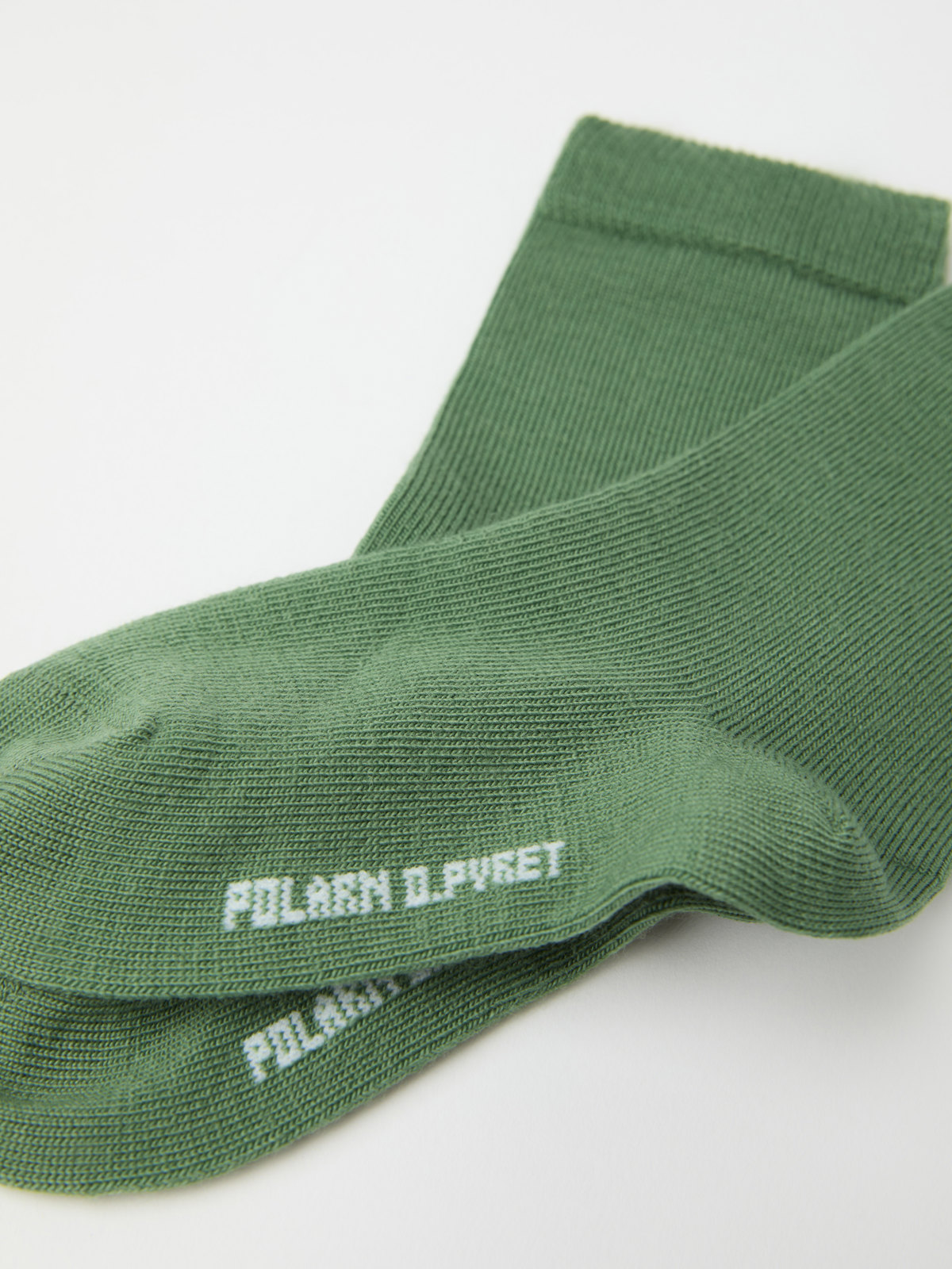 Ett par enfärgade strumpor i tunn merinoull som värmer gott och är mjuka för små fötter. Storleken är markerad på insidan av skaftet. Där finns också plats att skriva barnets namn. Lätt att hålla ordning!