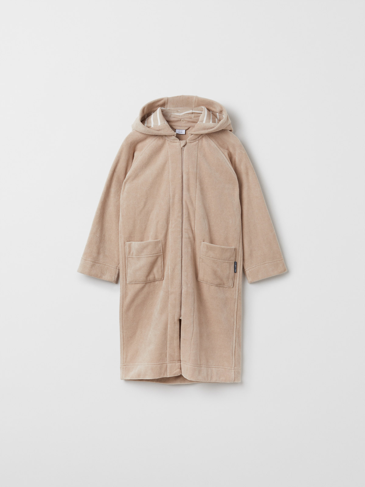 Badrocken är tillverkad i både mjuk ekologisk bomull och återvunnen polyester. Den har avtagbar huva som går att fästas med tryckknappar och ett mjukt bomullsfoder i vår klassiska rand. Badrocken slutar mitt på vaden och har två fickor fram och stängs med dragkedja.