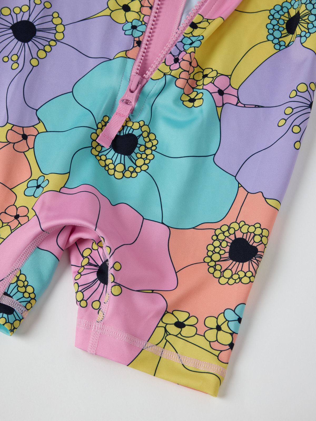 Blommig UV-dräkt med UPF 50 tillverkad i mjukt och skönt material av återvunnen polyester. UV-dräkten är sydd med extra mjuka sömmar som inte skaver. Dragkedjan fram gör den lätt att ta på och av och har ett skydd högst upp för att inte skava mot haka och kind.