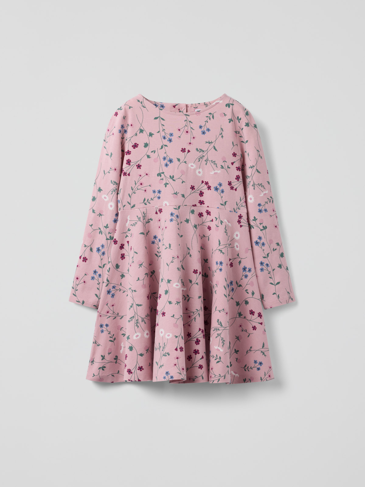 Den här klänningen är ett måste i barngarderoben! Den är tillverkad i mjuk ekologisk bomullstrikå och har extra vidd i kjolen som står ut fint när man snurrar. Klänningen stängs med knappslå bak på ryggen.