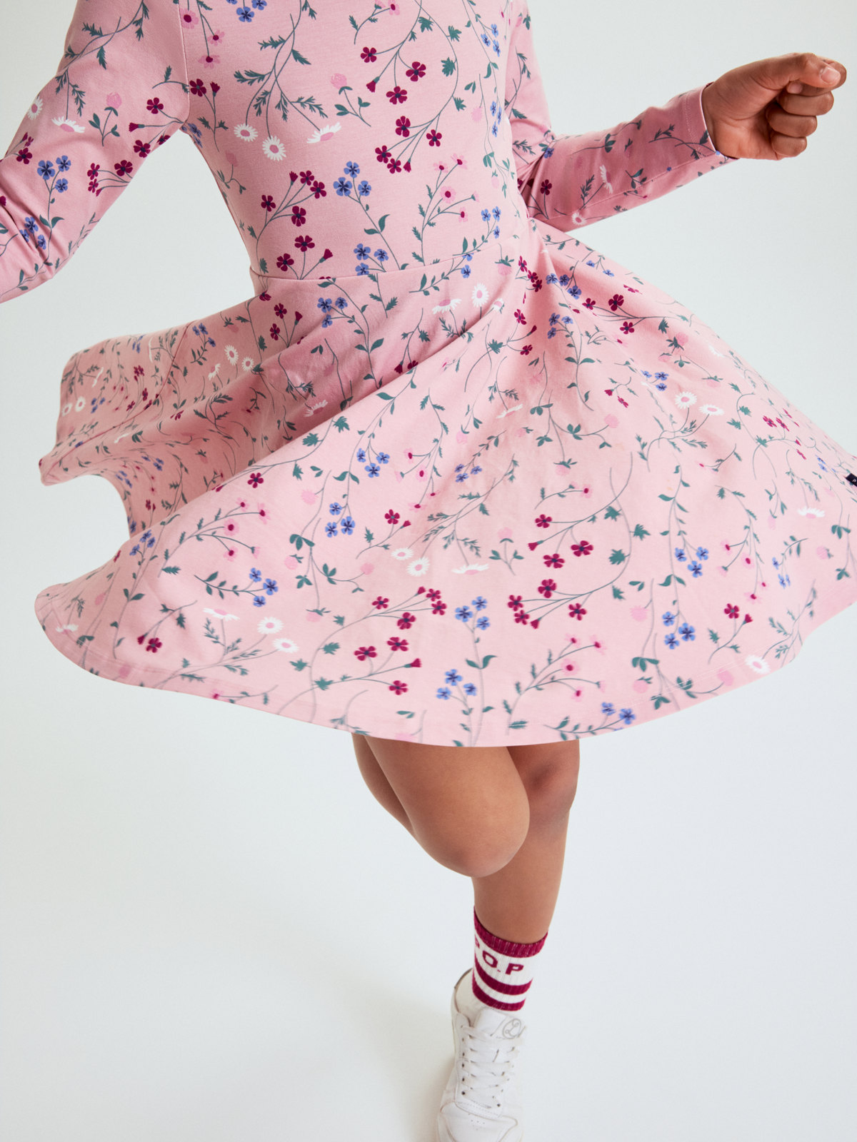 I storlek 86-92 är klänningen högre skuren i midjan och har en rynkad kjoldel.