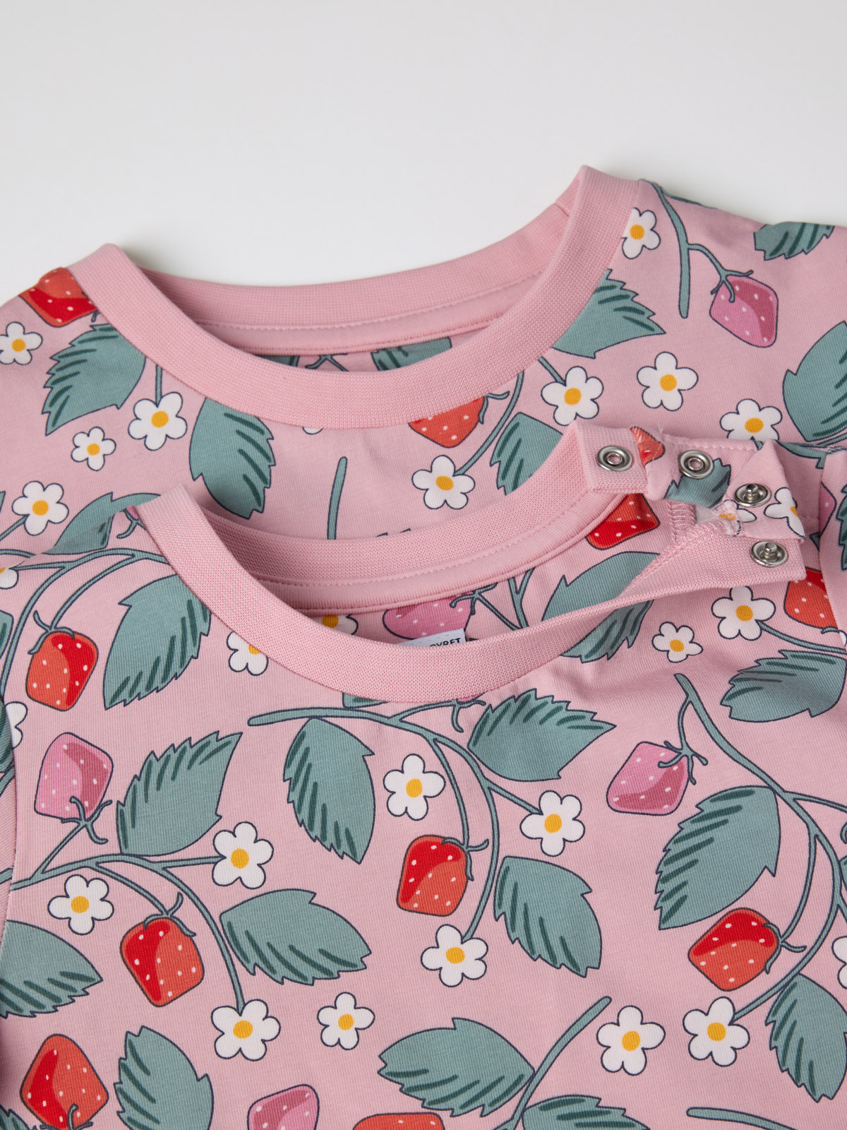 T-shirt i mjuk ekologisk bomull helmönstrad med jordgubbar – en riktigt sommarfavorit att älska länge och som passar till allt! T-shirten finns i flera färger och med olika prints som matchar fint med hela kollektionen. Hitta din favorit!
