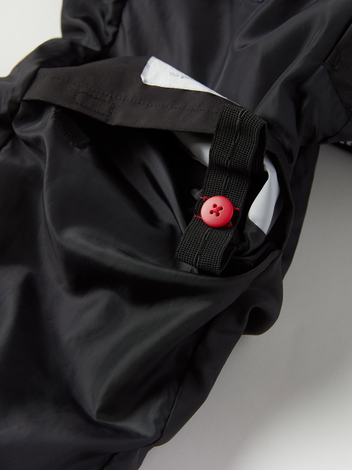 OBS! Jackan levereras i sin största storlek, vilket innebär att du inledningsvis får börja med att korta plagget till ursprungsstorlek, för att sedan justera ärmlängden allt eftersom barnet växer. Jackans ursprungsstorlek hittar du enkelt mellan de röda markeringarna på det elastiska knapphålsresåret. Vänligen notera att jackan har två justeringar i varje ärm för att plagget ska få en så bra passform som möjligt.