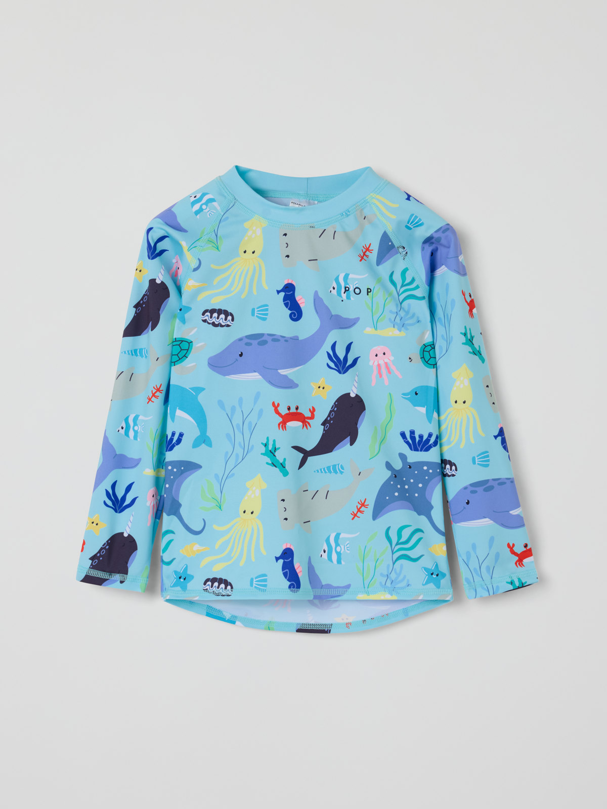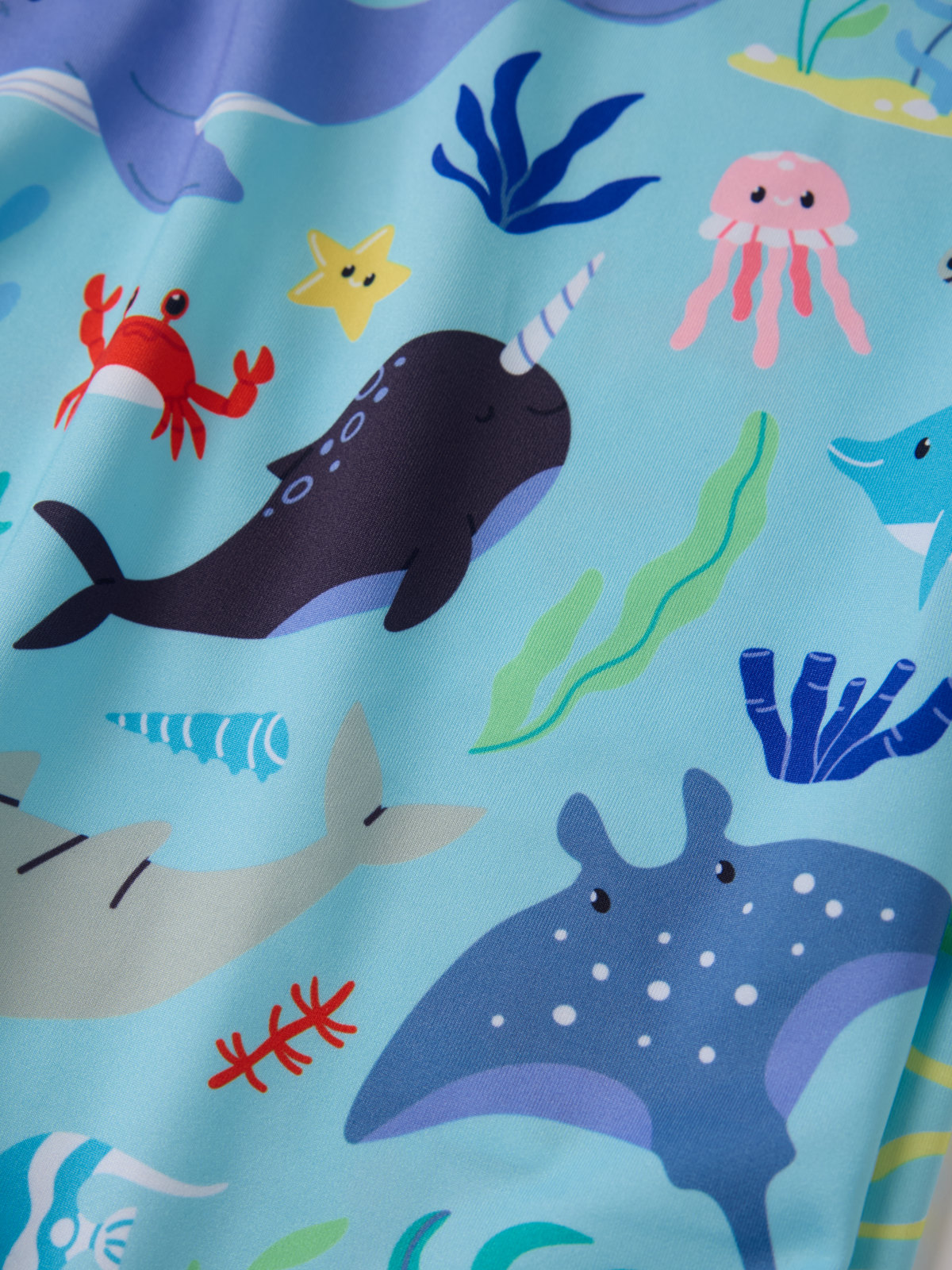 Långärmad UV-tröja med UPF 50, tillverkad i mjukt och skönt material av återvunnen polyester. Tröjan är helmönstrad med havsmotiv och är sydd med extra mjuka sömmar som inte skaver. Matcha med tillhörande UV-byxa!