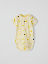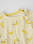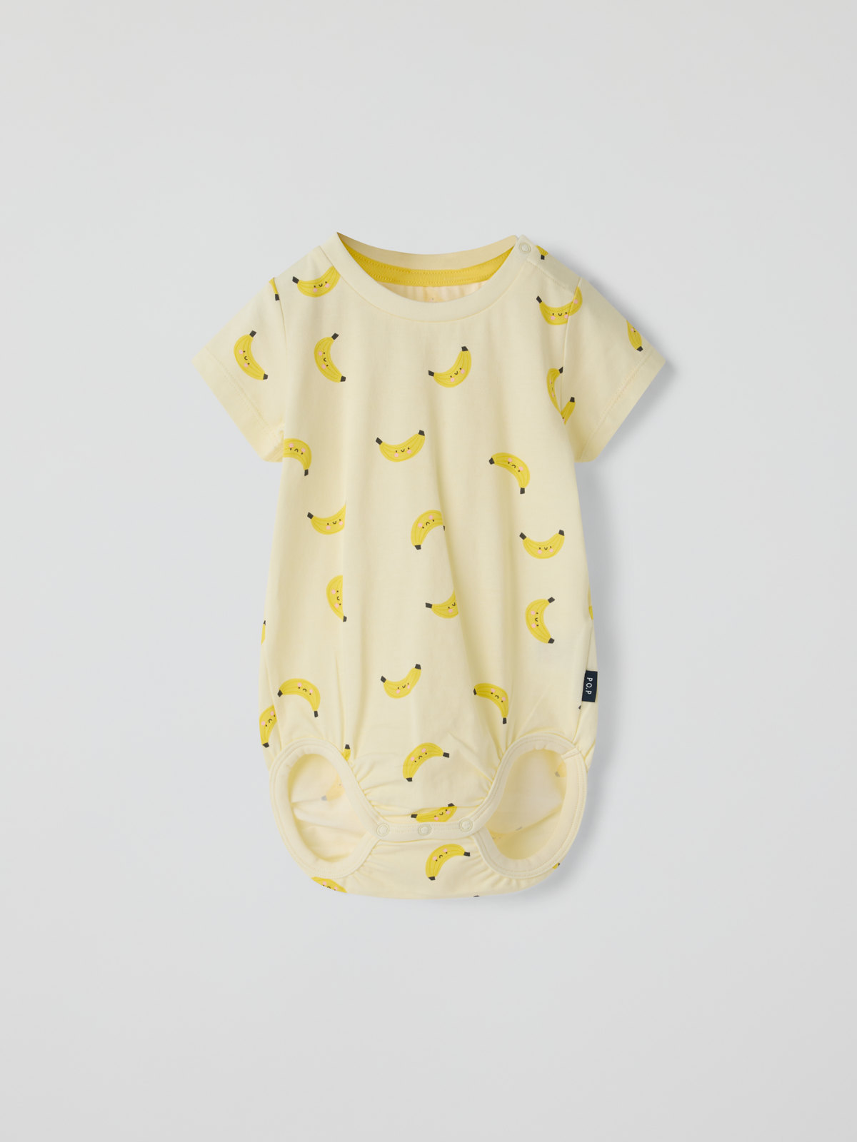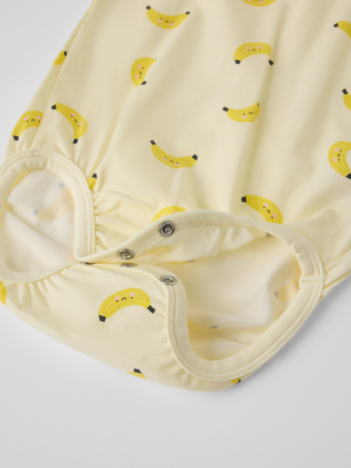 Kortärmad omlottbody i ekologisk bomull – ett basplagg att älska länge! Bodyn är helmönstrad med bananer. Knapparna på ena axeln och i grenen underlättar kläd- och blöjbyten.