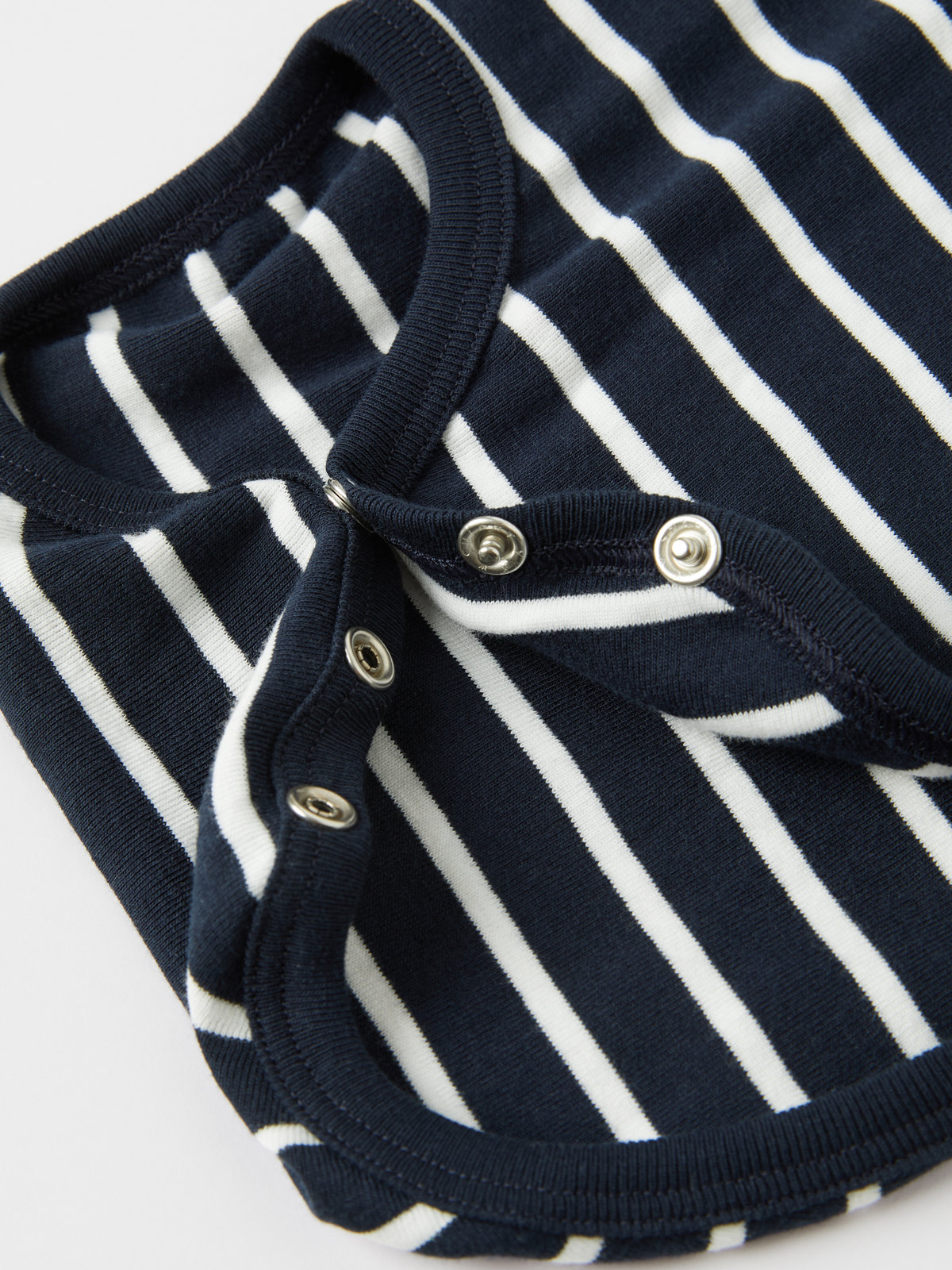 Randig body i 100 % ekologisk bomull för baby. Bodyn är sydd med extra mjuka sömmar som inte skaver mot känslig hud. Tryckknapparna längs omlottöppningen underlättar klädbyten.