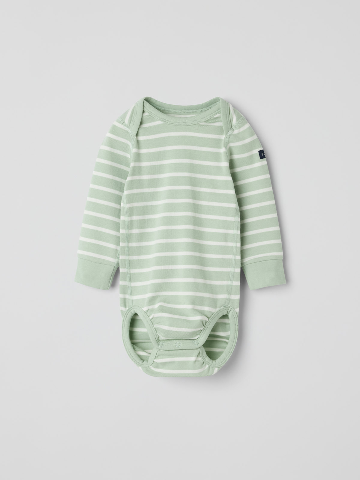 Vår klassiska randiga body i 100 % mjuk ekologisk bomull – ett älskat basplagg som är en självklarhet i allas första garderob! Bodyn har omlottlagda axlar, vilket gör den enkel att trä över bebisens huvud. Den har även mjuk mudd vid ärmslut.